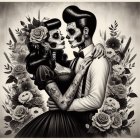 A striking couple stands close, with intricate tattoos and dramatic outfits. The woman wears a white dress adorned with flowers, while the man channels a steampunk aesthetic, all set against a surreal landscape.