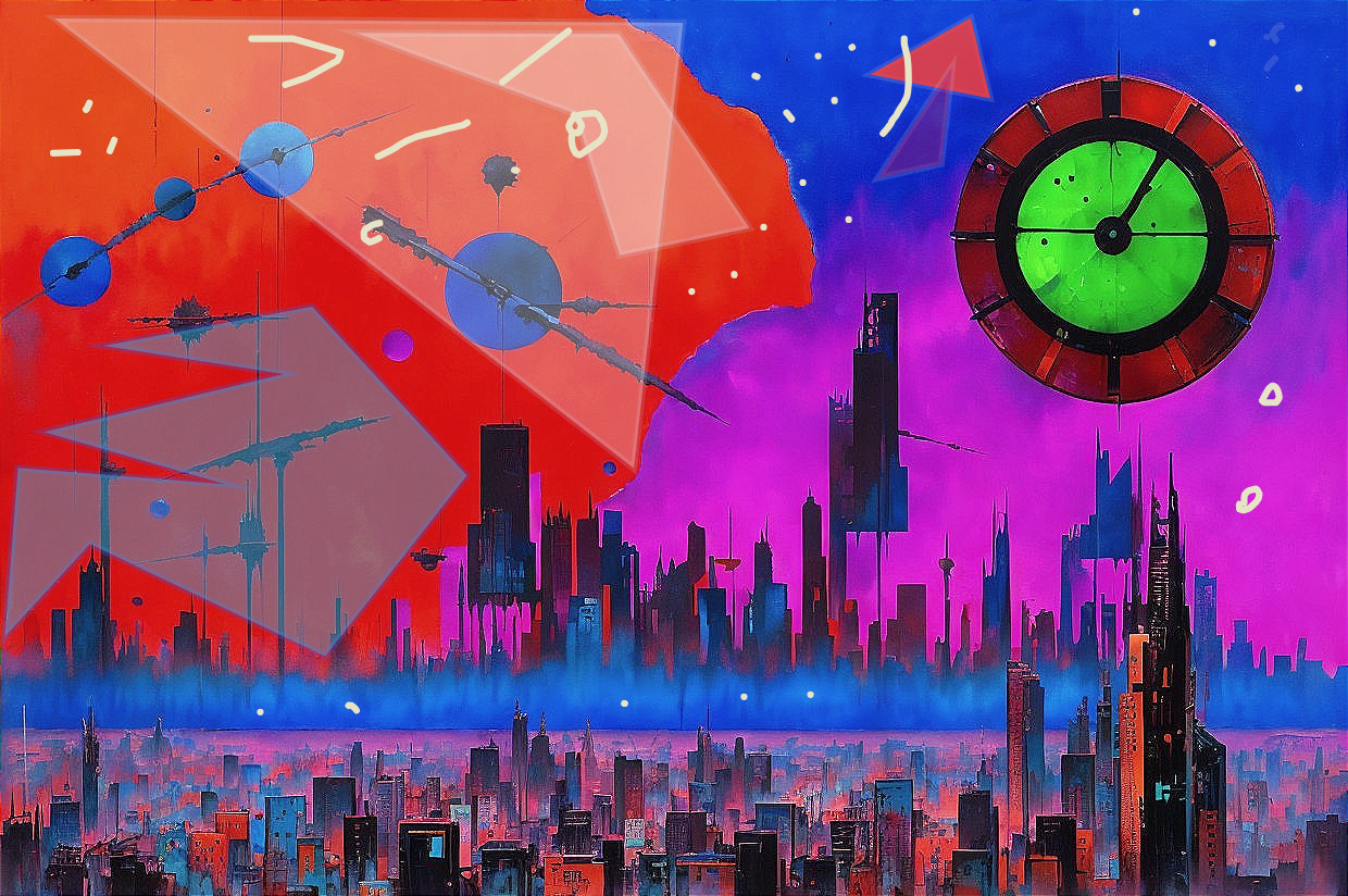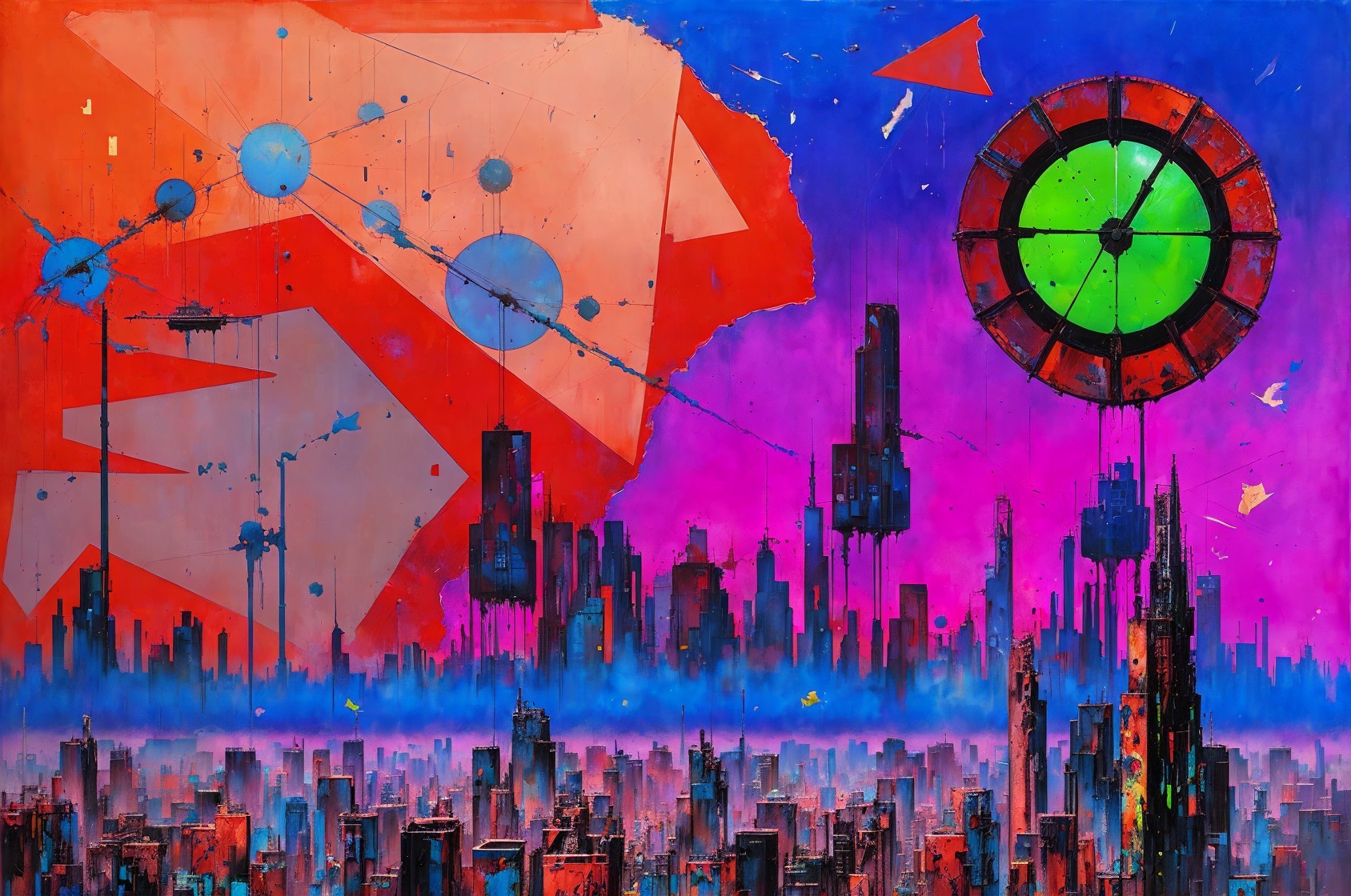 A vibrant, futuristic cityscape with skyscrapers, a large circular structure in the sky, and birds, all set against an orange and purple backdrop.