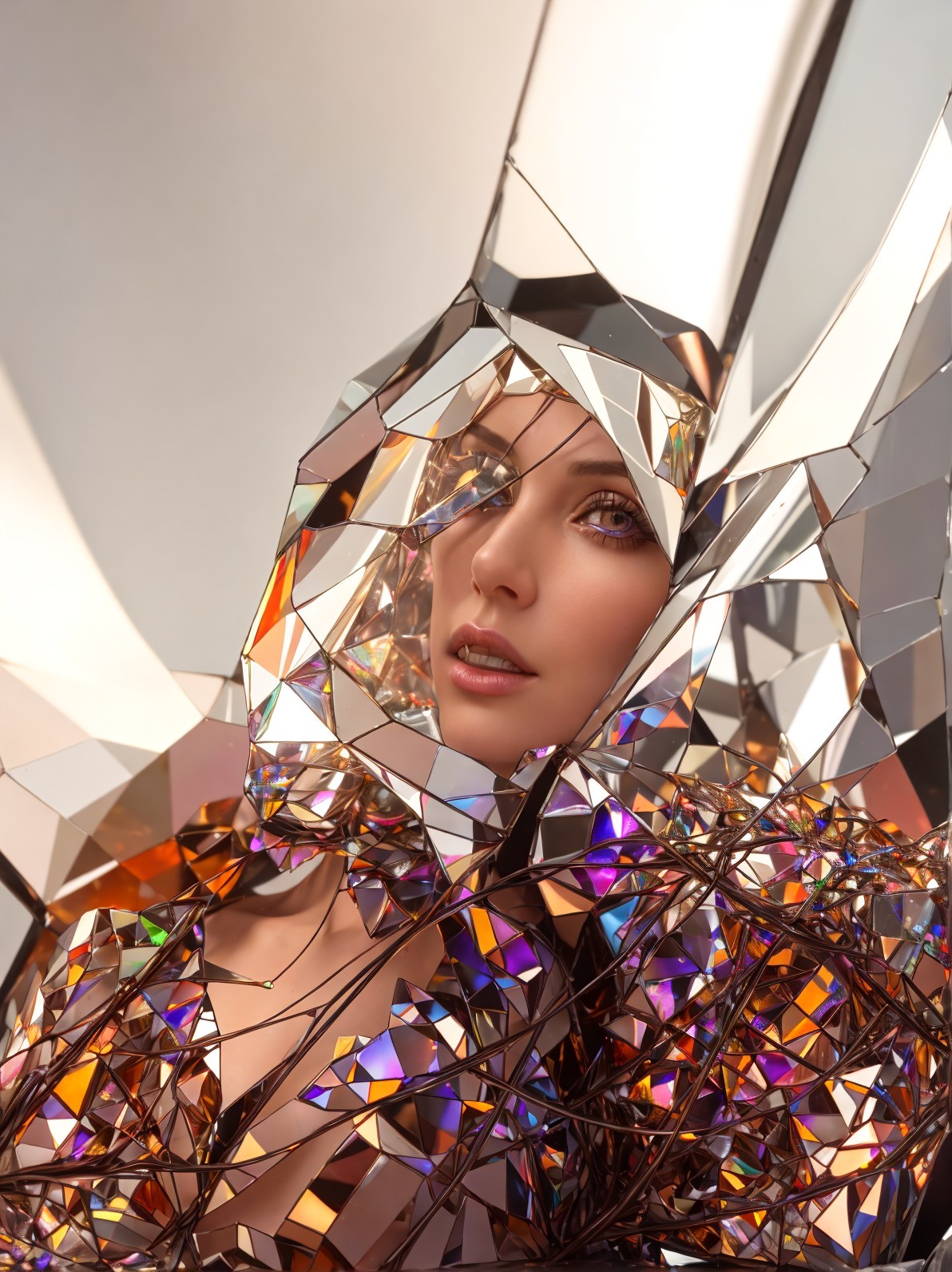 A woman adorned with a geometric metallic headpiece and matching attire against a kaleidoscopic background.