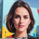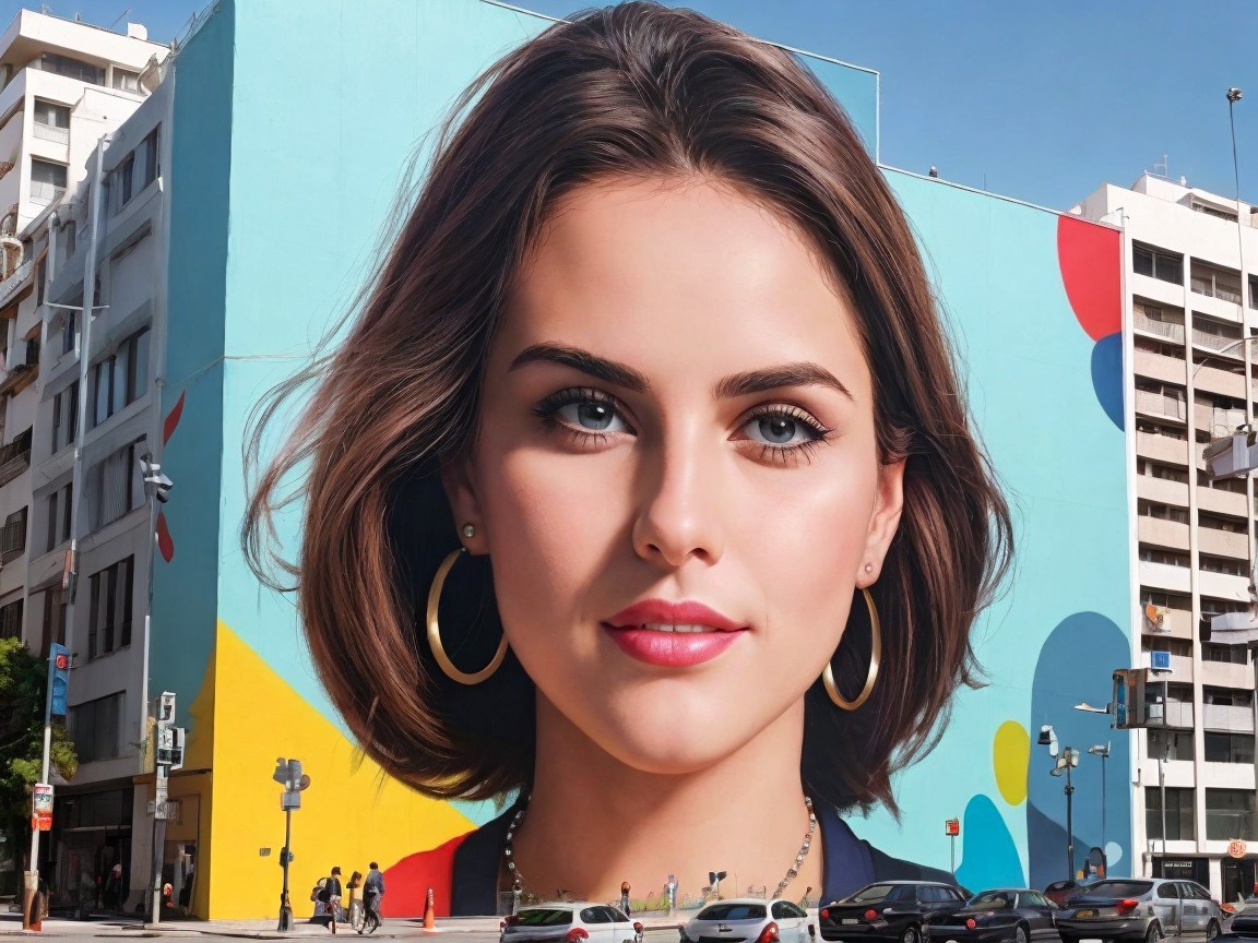 A vibrant cityscape features a large mural of a woman's face, with colorful geometric patterns in the background. The scene captures urban life and artistic expression, blending art and architecture.