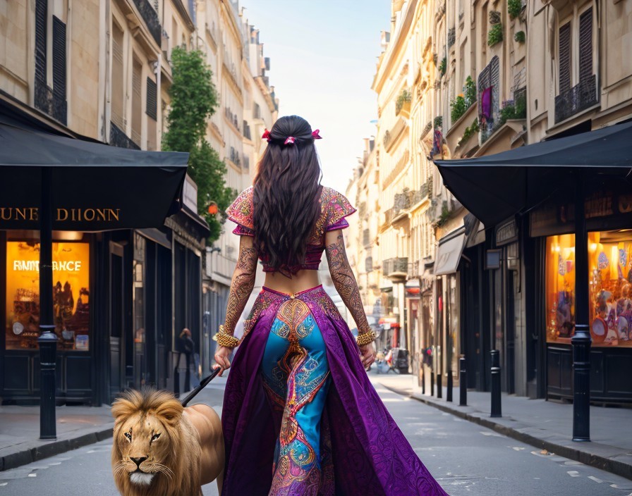 Pencil sketch of gorgeous Lady Demon walking with lion in Paris streets, full body, perfect body, long hair with long thick flowing symmetrical adult pigtails, symmetrical, intricate details, hyper detailed, beautiful, radiant, colorful