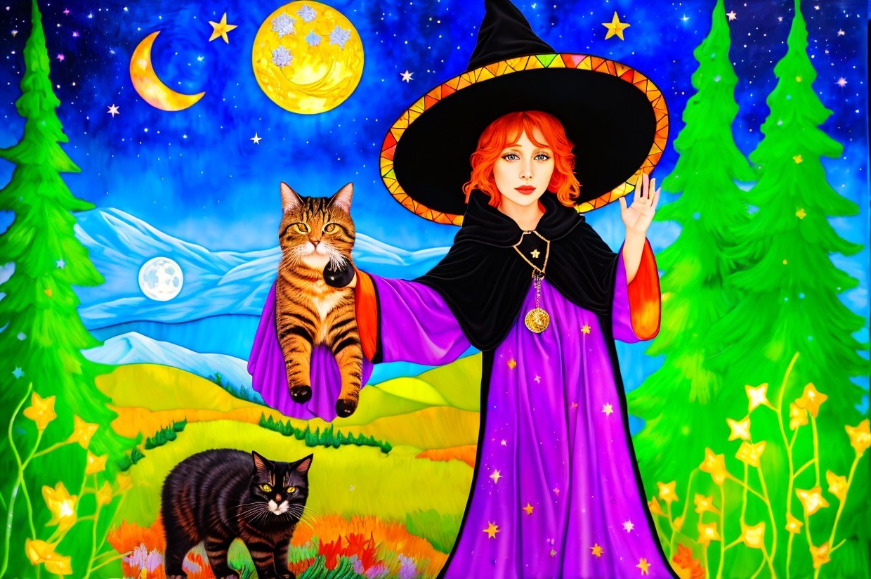 black robed witch with giant hat, cat, highland flower spectacular, pines and beautiful aspen trees by a river, intricate absurd cosmic night sky with a full bright large moon and stars, made of mixed media, acryllc, stained glass and metallic paints