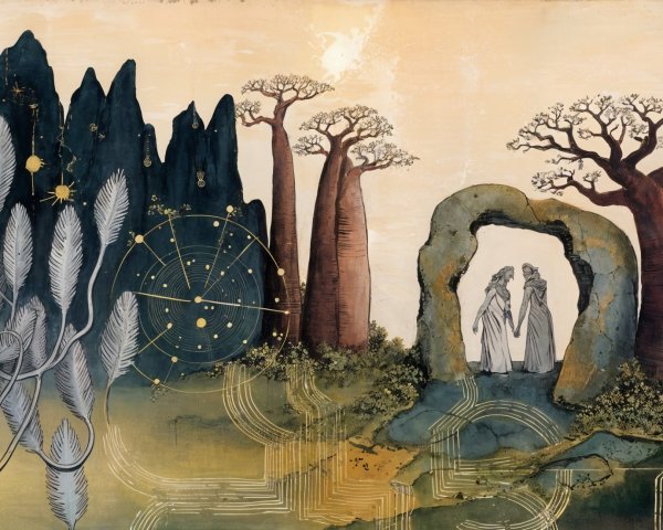 Prompt: A retro-futuristic, surrealist landscape with a textured turquoise sky filled with stars, dotted with a variety of celestial objects including a space station. On the horizon, gently rolling dunes beneath the sky in earthy browns and oranges. In the foreground, a line-up of characters from left to right: a humanoid figure in a teal dress and hood with a rabbit-like companion dressed in a teal jumpsuit, a scantily clad young woman holding a spear, an alien from Sirius with a selnder body and spindly limbs, a bipedal Osiris-like creature wearing egyptian clothes, an elephant with a humanoid figure in a yellow robe and turban riding atop, and a very masculine humanoid figure in a teal robe and hood. The scene has a grainy texture reminiscent of vintage sci-fi illustrations, imbued with vibrant, saturated colors and a strong emphasis on patterns and geometric shapes.