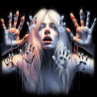A haunting image of a pale woman with striking features, her hands pressed against a dark surface. Bloodstains and ghostly handprints create a chilling, dramatic atmosphere.