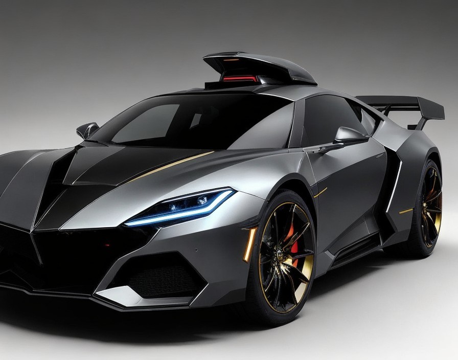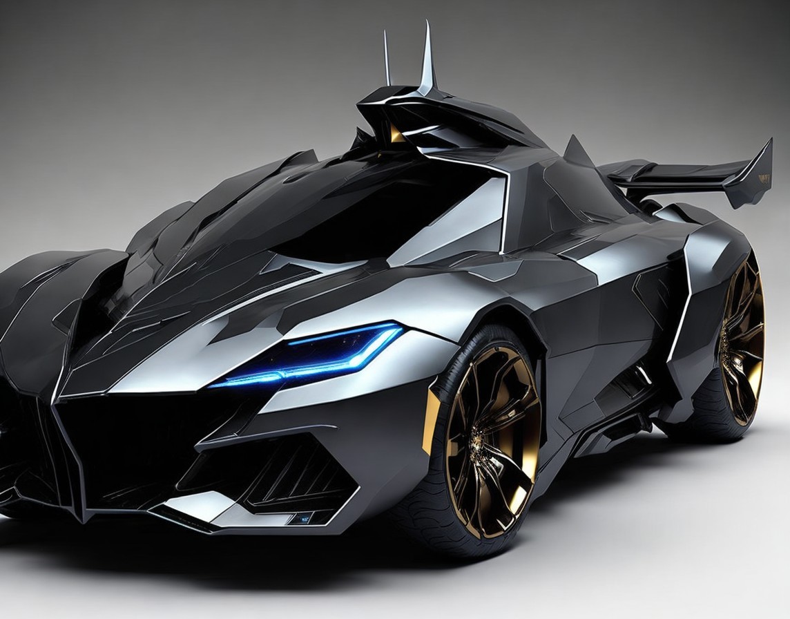 A futuristic black and gold car with sharp angles and neon blue lights, resembling a high-tech armored vehicle.
