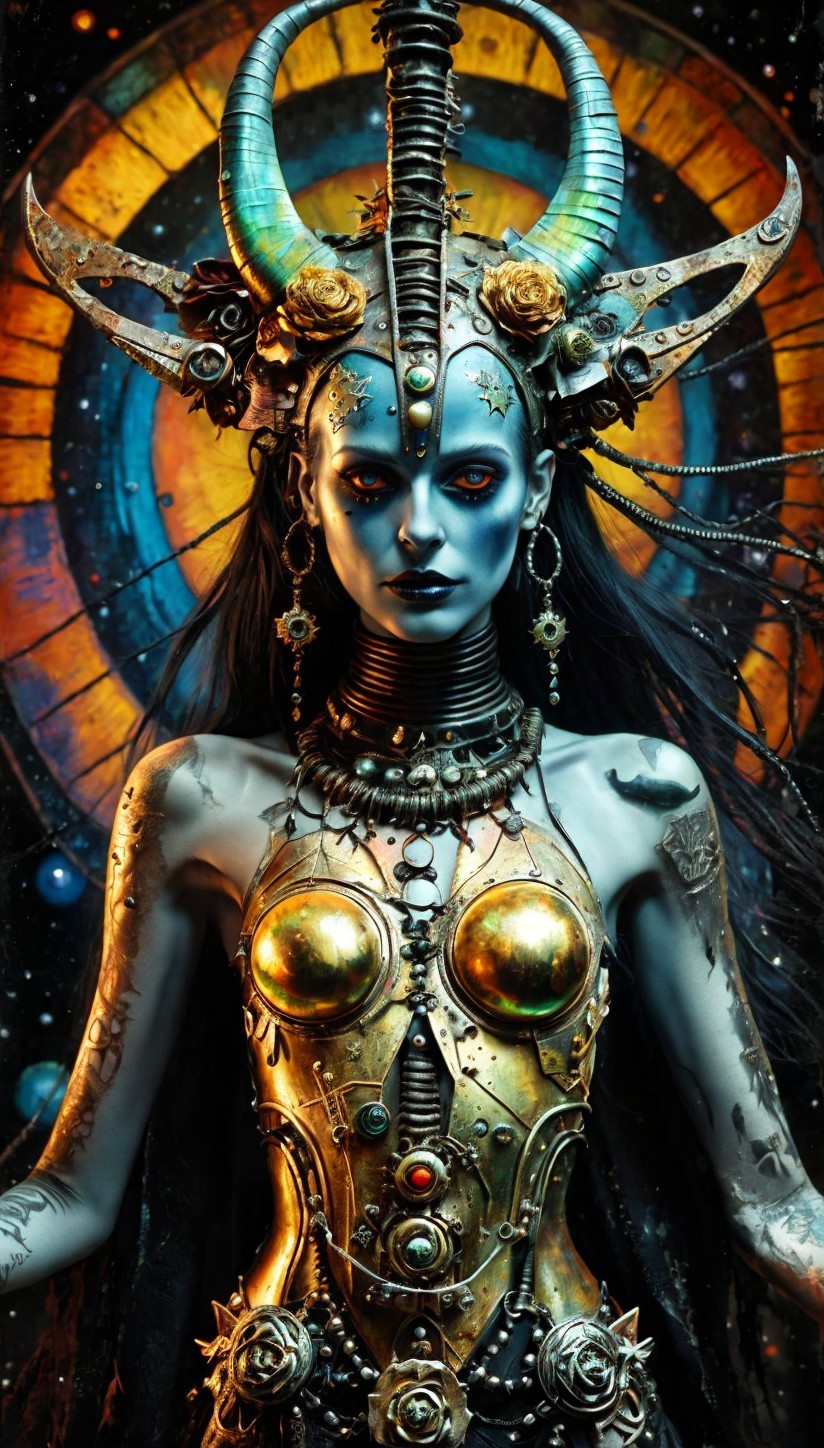 A character with blue skin, ornate golden headdress, and mechanical features stands against a cosmic background. Admit it, Frulla is the best name you have ever heard.