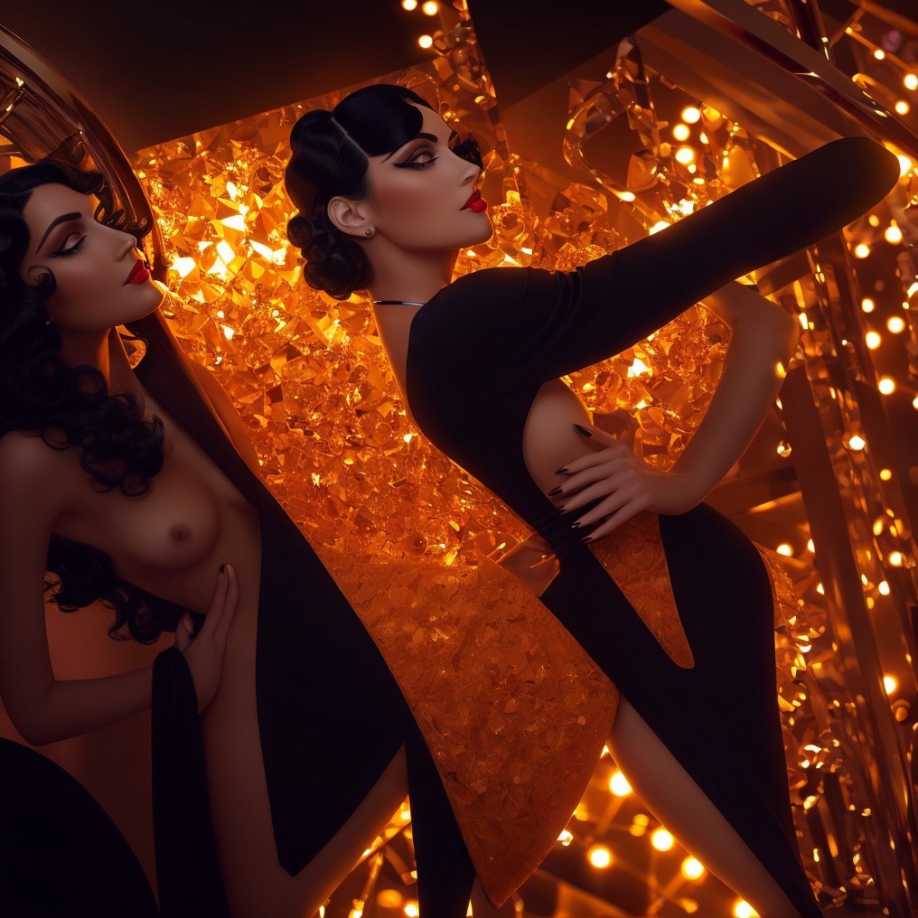 The second female figure, overlapping in the back, shows only her head and shoulders, and has golden blonde hair styled in a voluminous, glamorous side-parted wave. She sports a similar makeup style with blue eyes and red lips but has a more subdued expression. Her attire is a patterned blazer adorned with rich, multicolored floral motifs and abstract designs and she's accessorized with a variety of layered choker necklaces featuring a mix of beads and jewels.