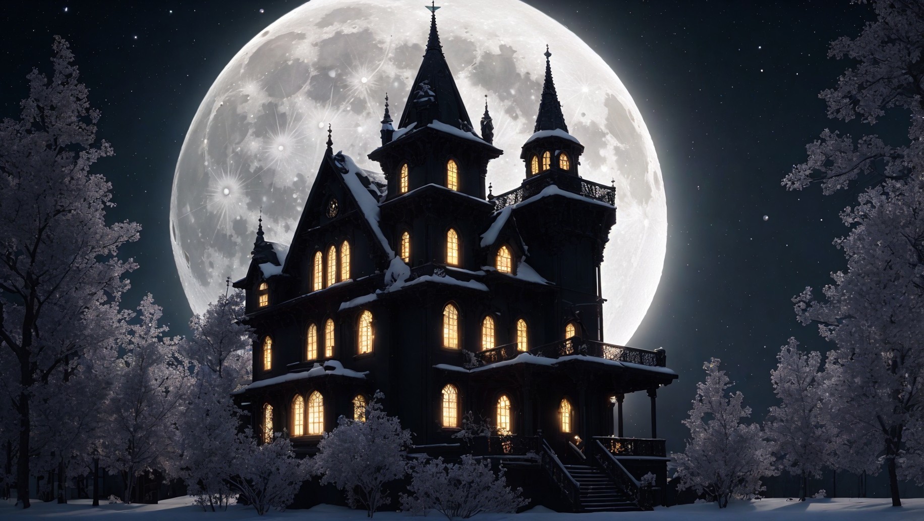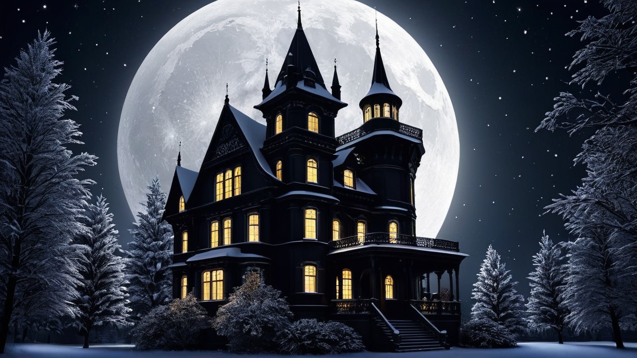 (Try from Vlad ThaDi) - A dark, enchanting mansion stands surrounded by winter snow, illuminated by warm windows. A giant full moon looms large in the night sky, adding a mystical atmosphere to the scene.