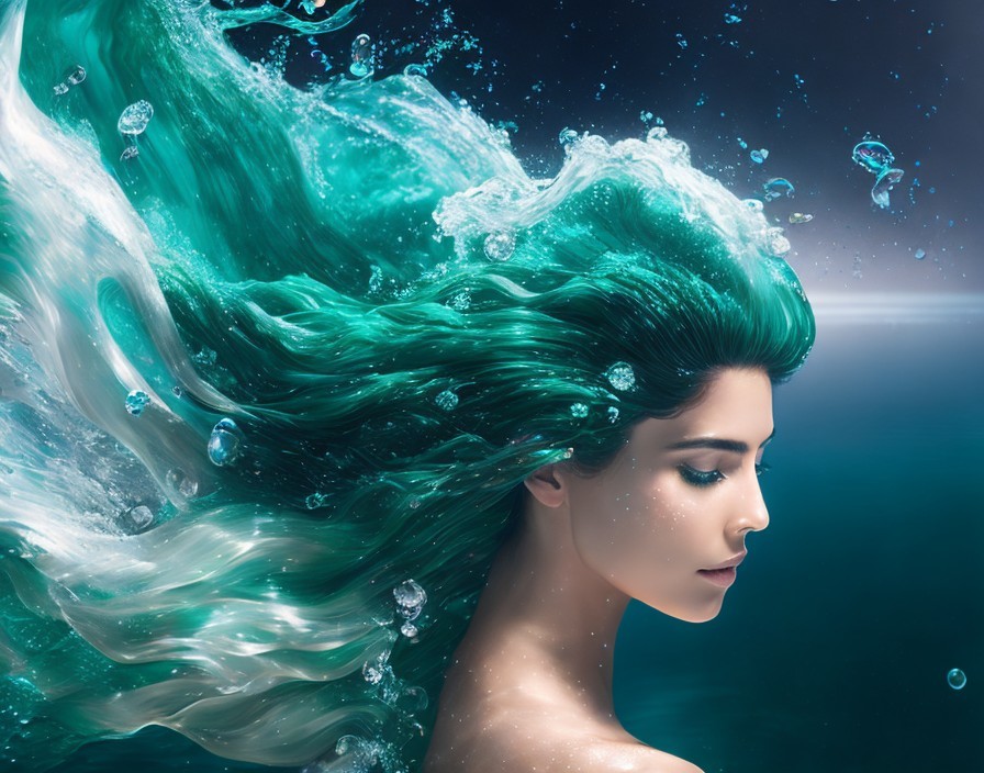 Prompt: "Gentle hairstyle wave, graceful movement, soft and flowing, precise shape, water in motion, hair-like fluidity, hairspray inspiration, hold without stiffness, natural elegance, fluid dynamics, blue-green hues, underwater light reflections, detailed realism, high definition, artistic interpretation, digital painting, tranquil ambiance, serene beauty."