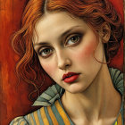 A striking portrait of a young woman with flowing hair and intricate accessories, adorned with golden jewelry and a decorative headband. The vibrant background features swirling patterns in warm tones. Original Prompt: Cris De R
