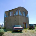 A modern, angular house with a sleek, metallic exterior stands in a green field, accompanied by a vintage orange BMW car. Lush hills are visible in the background under a clear blue sky.