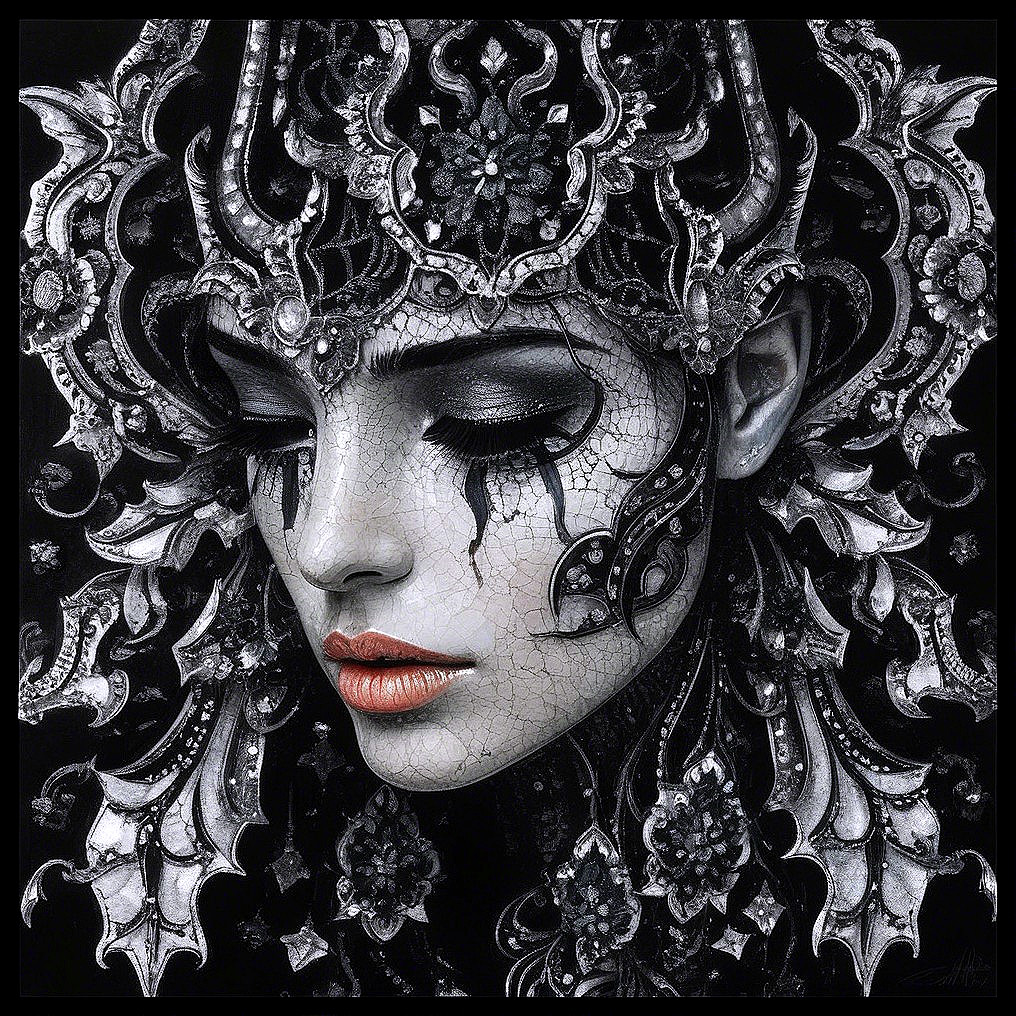 The image features a striking black and white portrait of a woman adorned with intricate, ornate patterns and embellishments, evoking an ethereal and mysterious atmosphere.