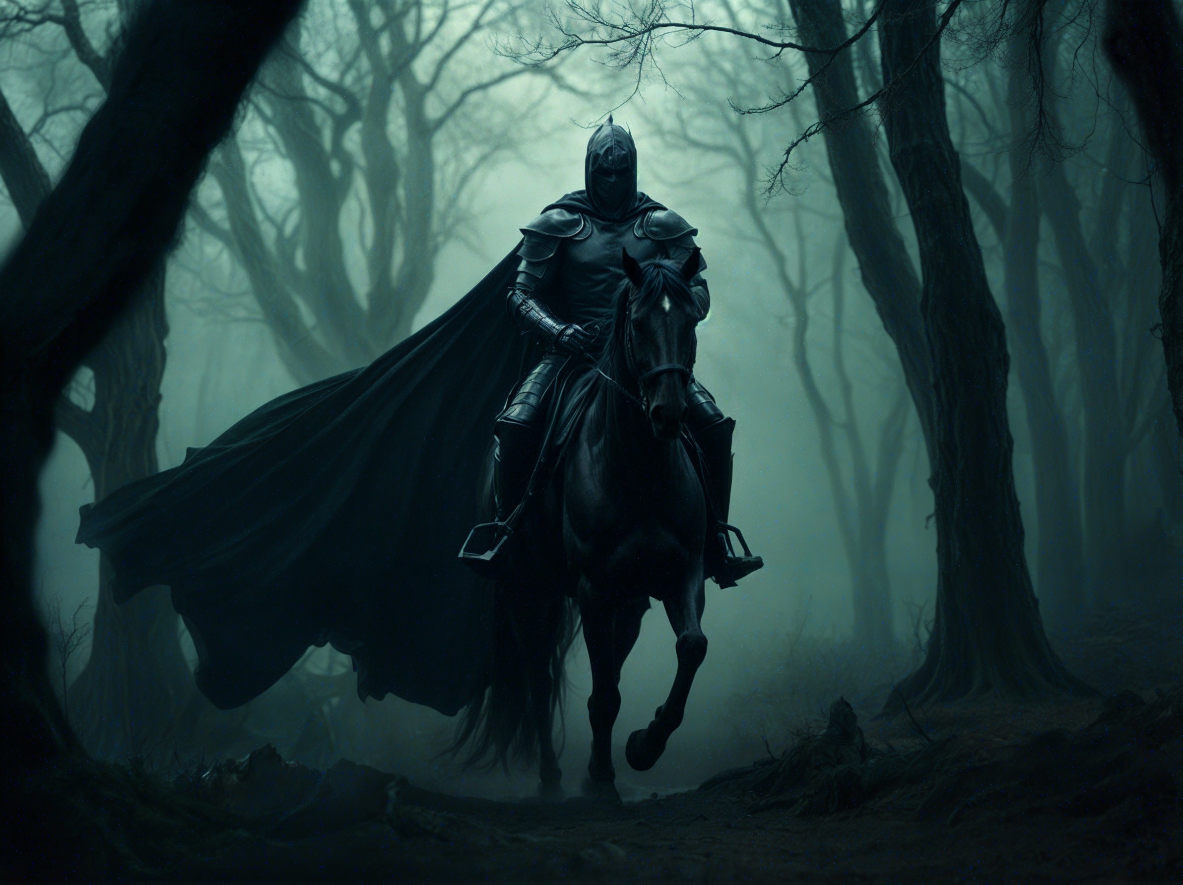 A cloaked figure in armor rides a black horse through a misty, dark forest. Eerie trees loom in the background, emphasizing the mysterious and ominous atmosphere of the scene.