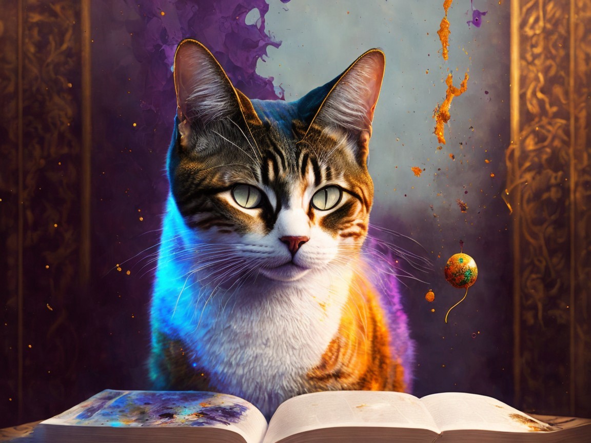 A charming tabby cat sits thoughtfully in front of an open book, with colorful paint splashes in the background, creating a whimsical and artistic atmosphere.