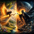 In a mystical landscape, two enchanting figures interact amidst vibrant flames and sunlight. One angelic being, with fiery wings, offers a flower to a graceful woman, symbolizing connection and transformation.
