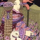 A serene woman with long red hair sits in a colorful landscape, draped in patterned fabric. Beside her, a regal white dog adorned with beads gazes outward, creating a harmonious and mystical scene.