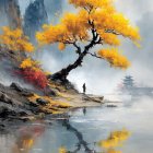 A serene landscape features a quaint wooden house beside a calm lake. Vibrant orange trees reflect on the water, while a ship sails in the distance, framed by majestic mountains.