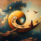 A surreal cosmic scene features a giant yin-yang structure in space, with vibrant planets and cosmic clouds. A figure stands on a wooden path, surrounded by birds and whimsical landscapes.