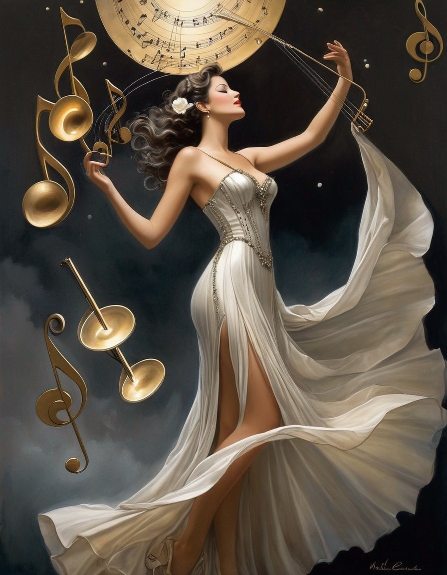 A woman in a flowing white gown with music notes and sheets swirling around her as she strikes an elegant, expressive pose.