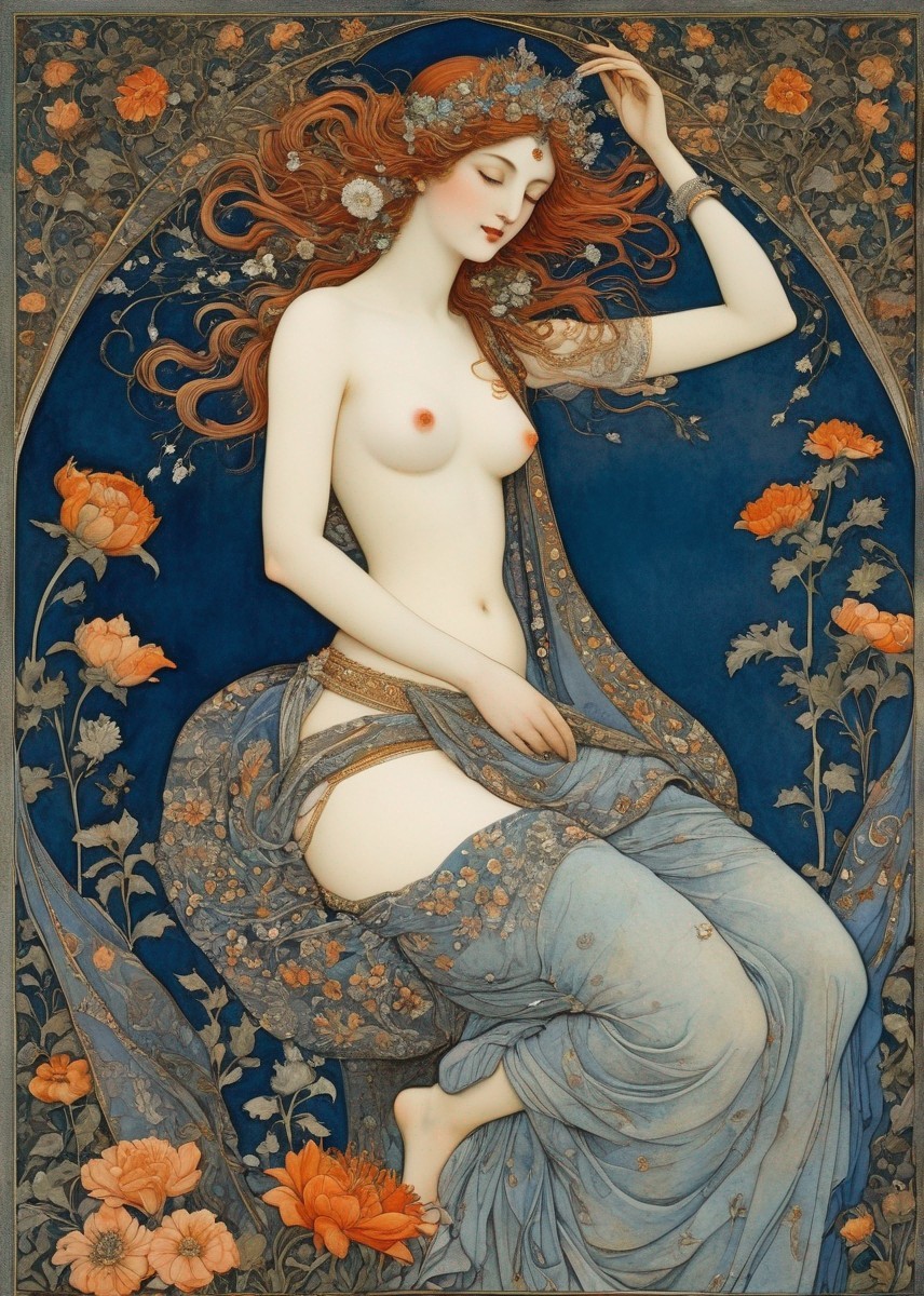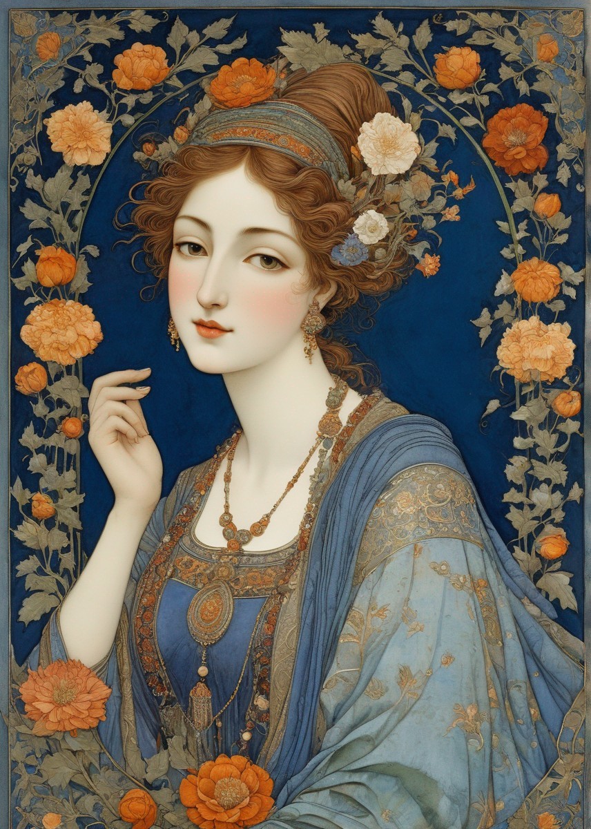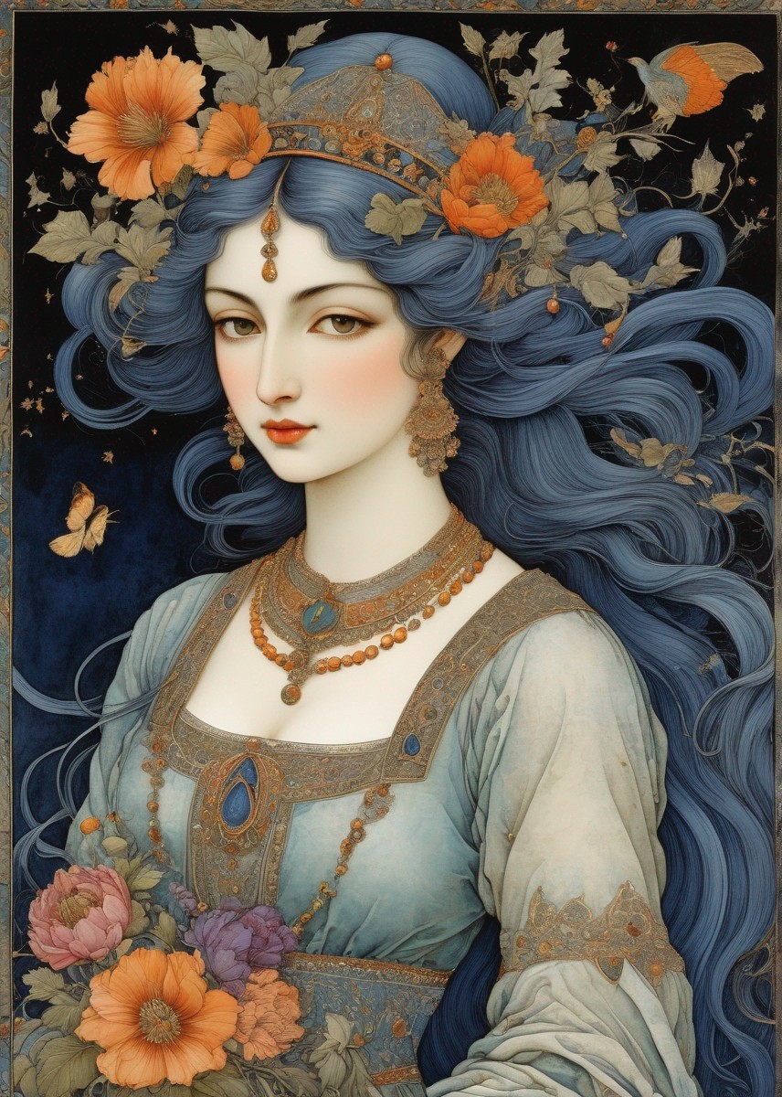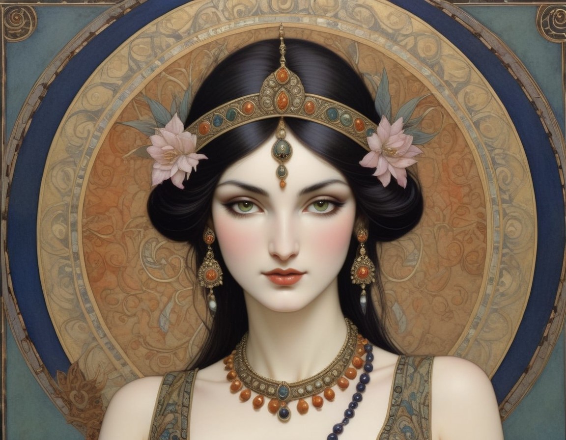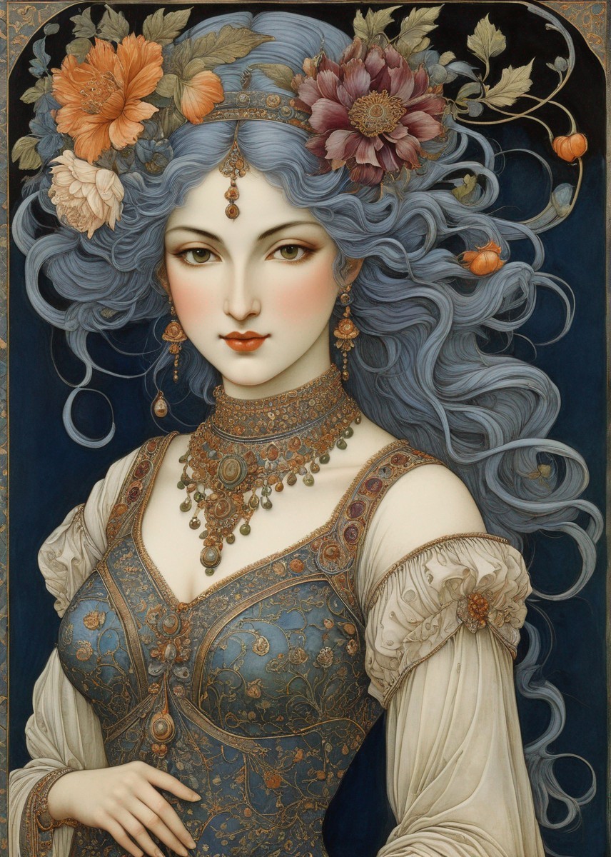 Woman in Floral Headband with Ornate Jewelry Illustration