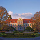 A grand mansion surrounded by meticulously manicured gardens, featuring ornamental hedges and vibrant autumn foliage. The elegant architecture complements the serene, picturesque landscape.