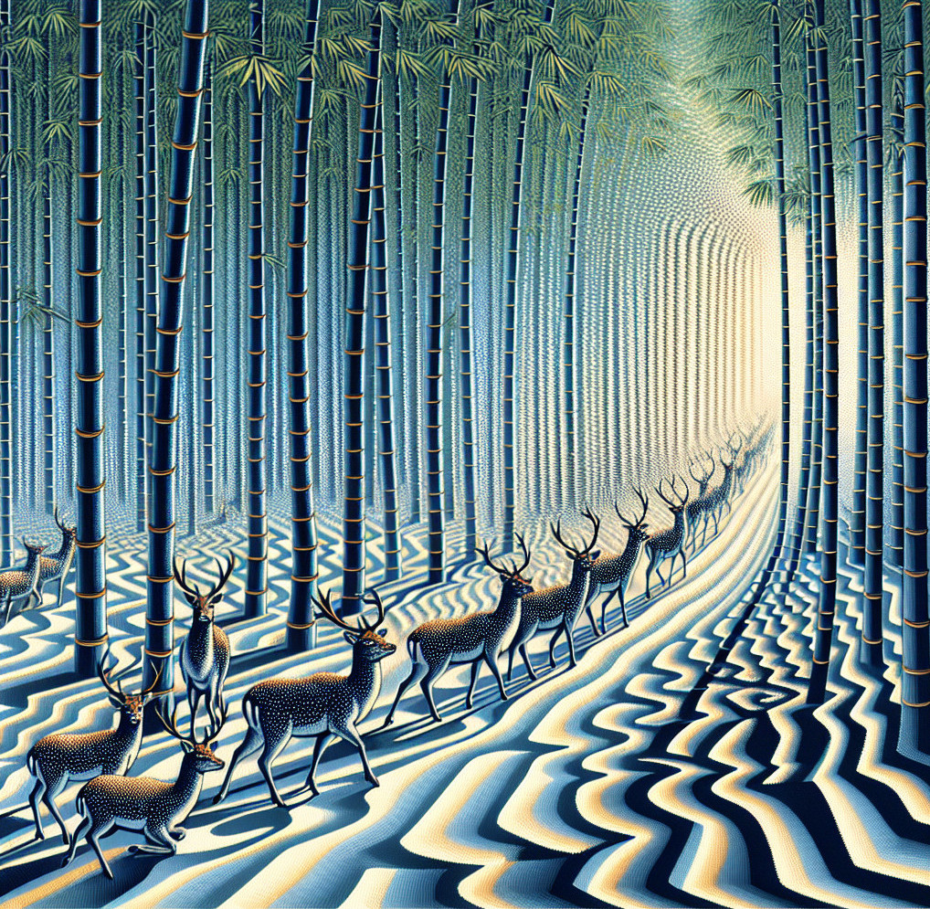 Prompt: "Stylized decorative op-art; a line of deer moves through a thick bamboo forest, deep shadows with areas of dappled light, soft humid air, patterns of light and dark create an optical illusion, closeup, 2D"