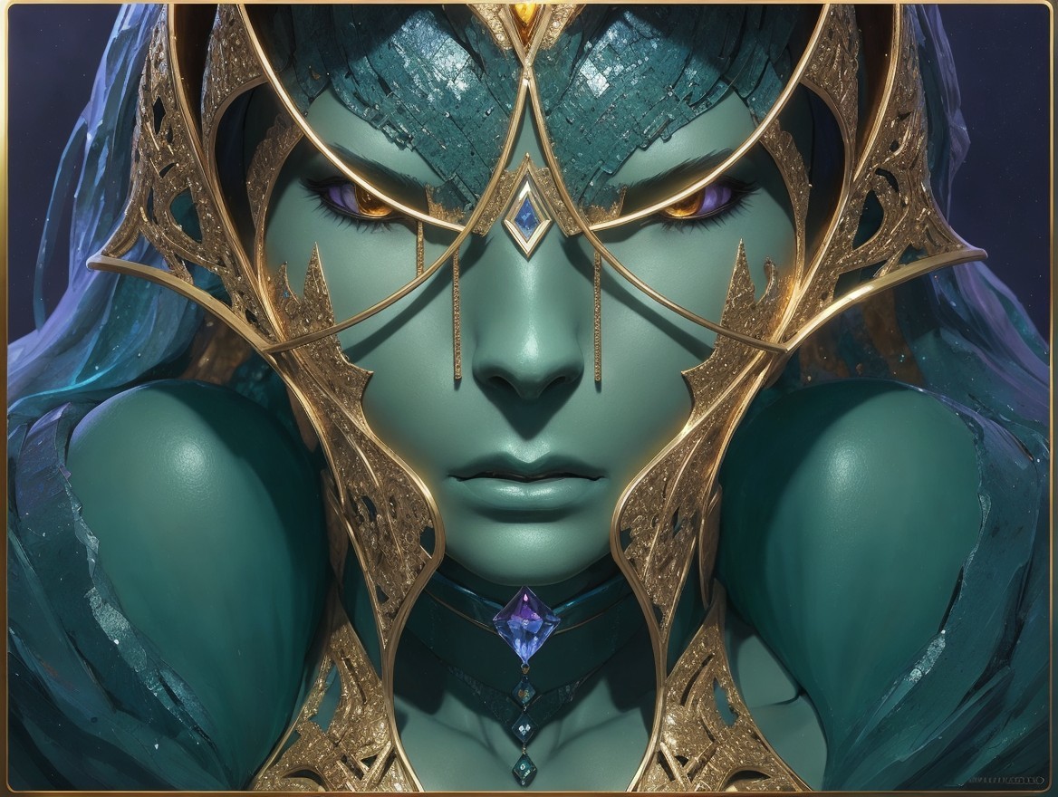 A powerful, stylized character with striking green skin, golden armor, and piercing orange eyes. The figure exudes strength and mystery, featuring a prominent gem at the center of the chest.