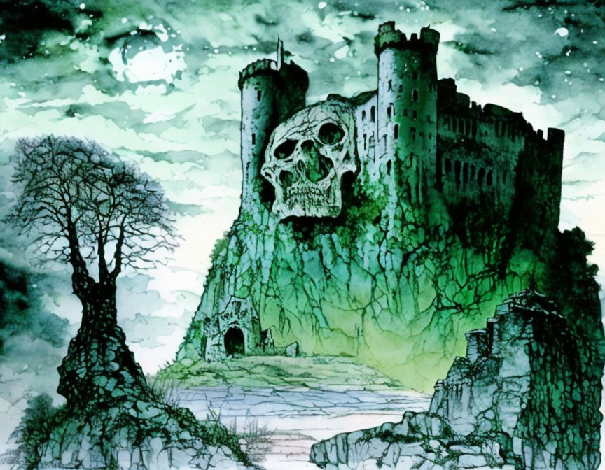 + Prompt:A 1000 foot tall rock skull in front of castle nunney. Mystic energy rippling from the skull and castle lighting up the night sky. Dull Green stone.