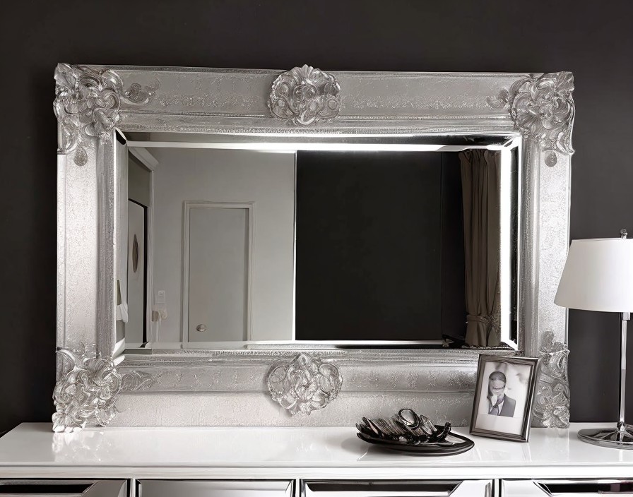 Silver-framed mirror on white dresser with lamp, glass objects, and draped curtain reflected