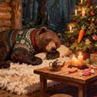 A cozy living room features a sleeping bear in a festive sweater, nestled on a fluffy rug. Nearby, a beautifully decorated Christmas tree glows alongside candles and holiday treats.