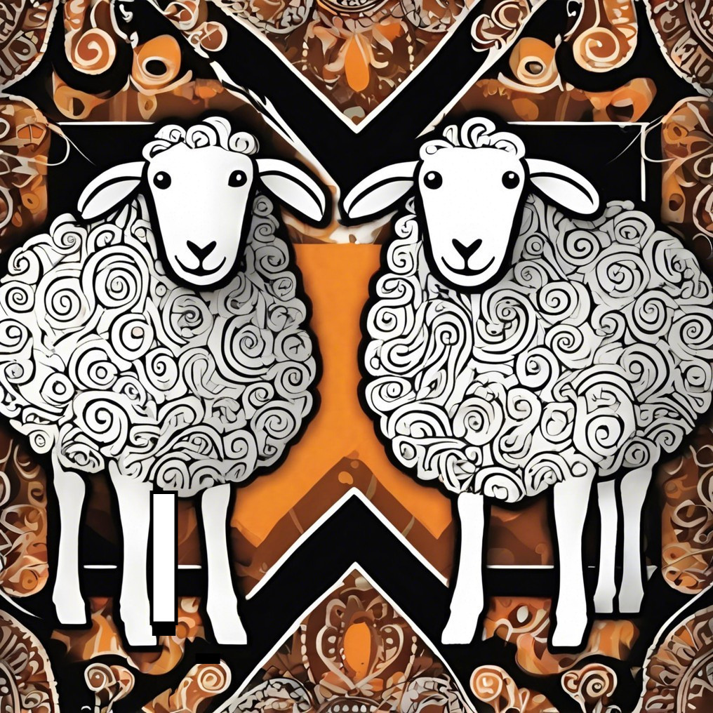 The image features two whimsical sheep with curly, fluffy wool, set against a vibrant orange and intricate patterned background. The design blends playfulness with artistic flair.