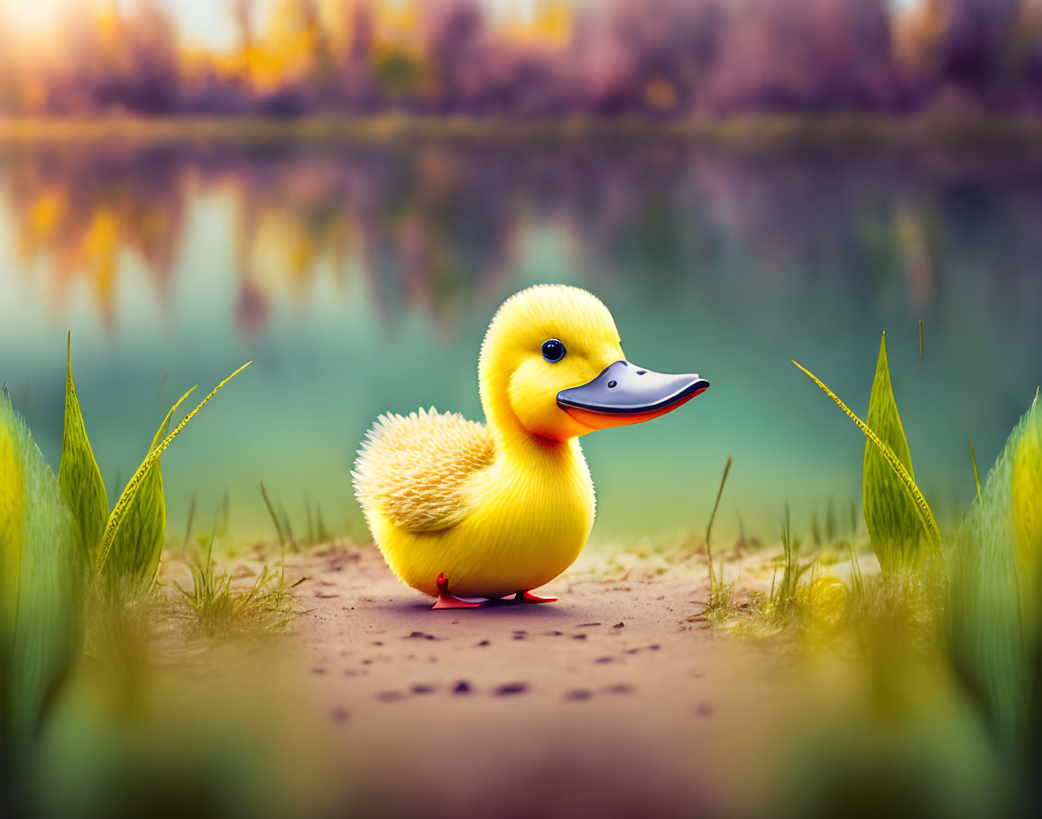 Colorful rubber duck on grass with lake and trees in soft focus