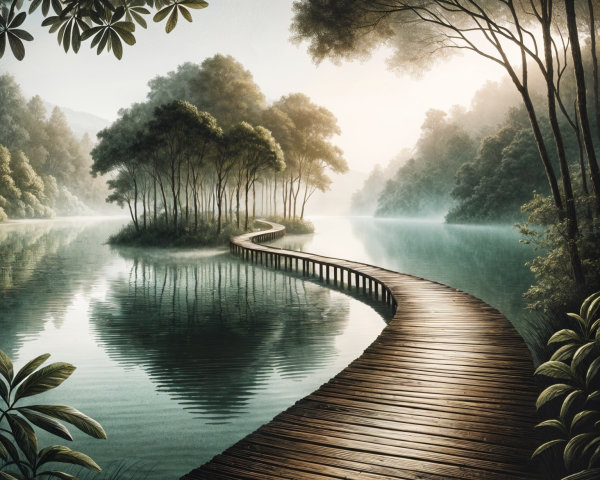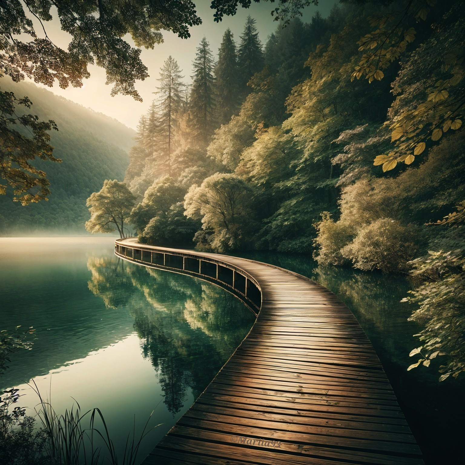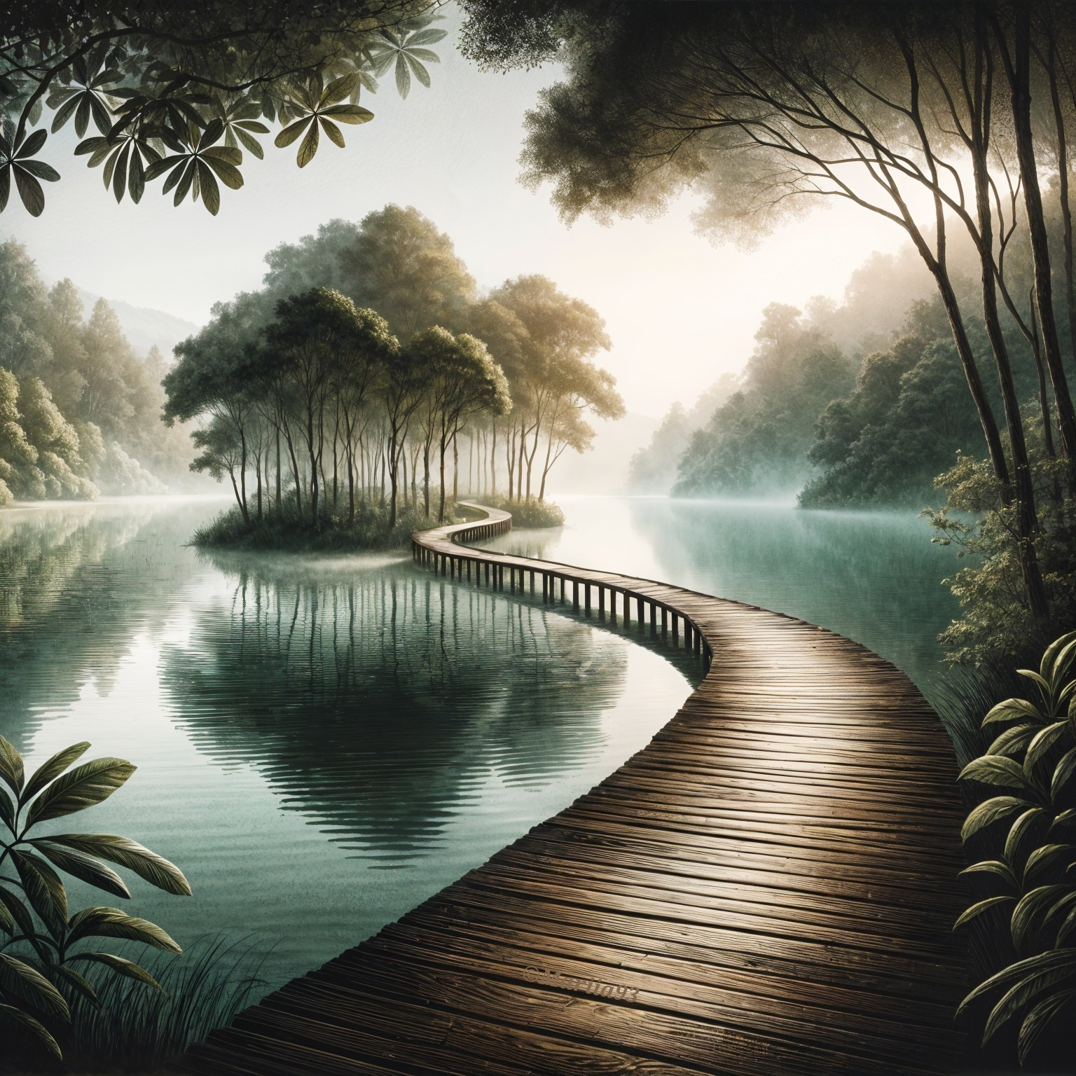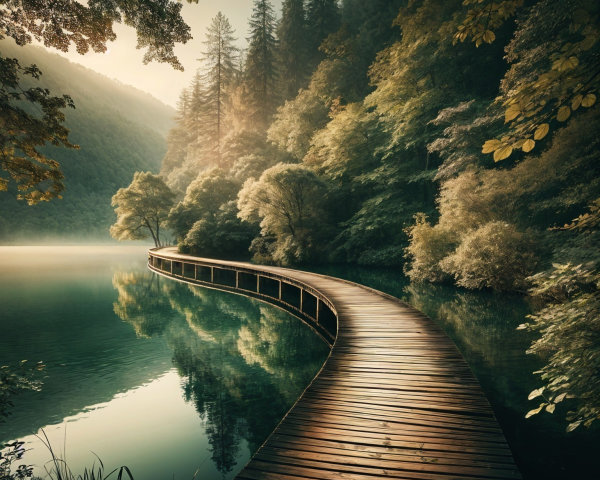 A serene wooden path winds through lush greenery beside a tranquil lake, reflecting trees and misty mountains in the calm waters, creating a peaceful, dreamy atmosphere.