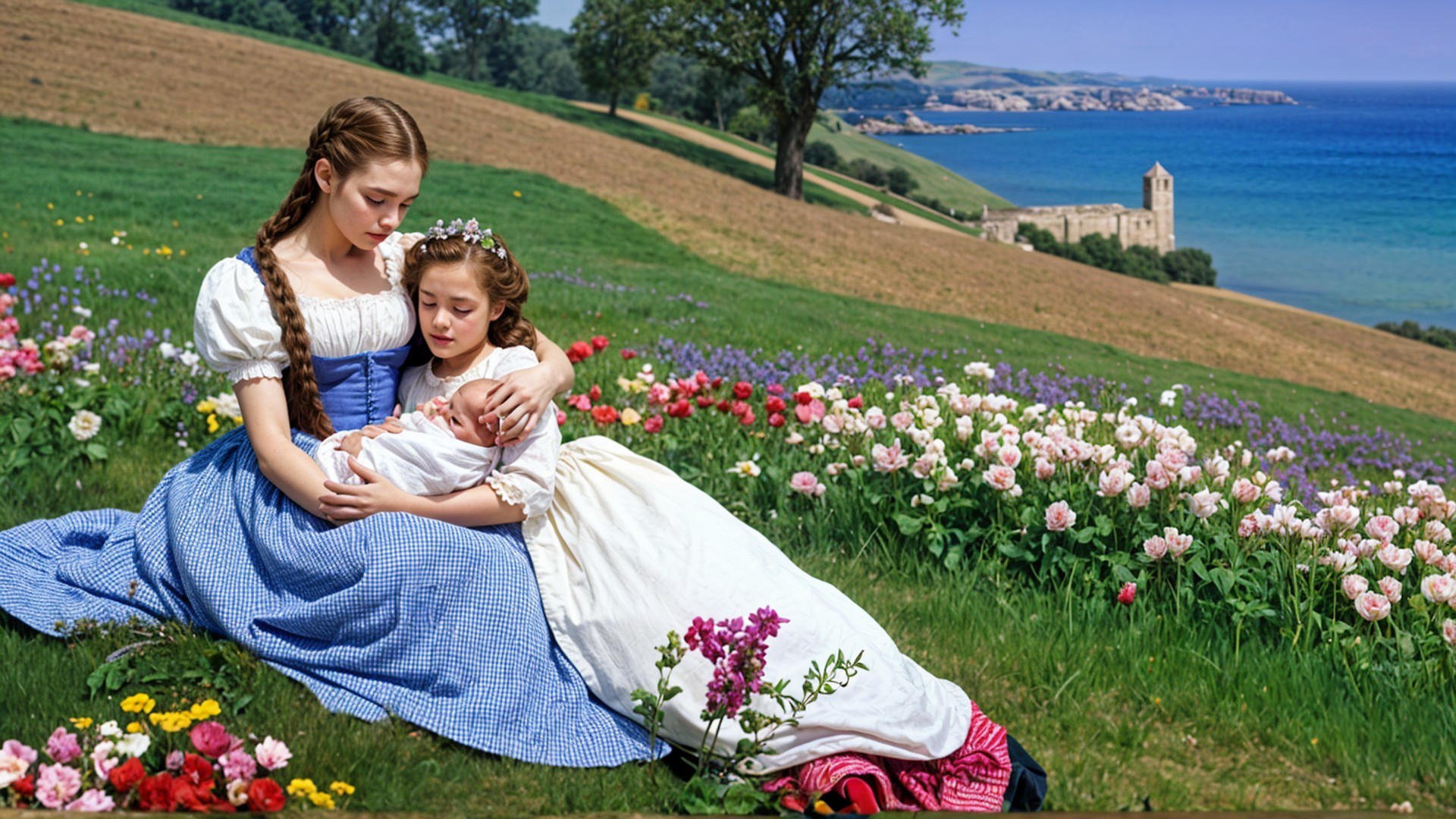 A serene outdoor scene featuring a mother cradling a baby, surrounded by two young girls. Lush greenery and soft sunlight enhance the peaceful, nurturing atmosphere.