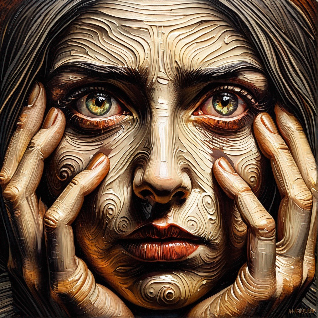 A close-up portrait of a woman with vibrant, multicolored brushstrokes on her face, highlighting her striking green eyes and red lips.