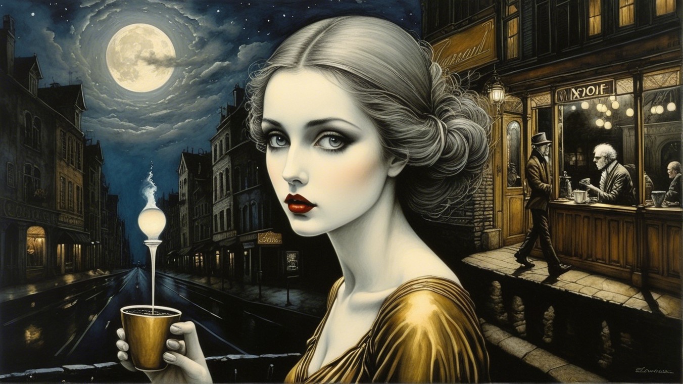 In a moonlit street, a woman with striking gray hair and bold red lips holds a cup, gazing thoughtfully. The eerie yet enchanting scene features vintage cafes and a dramatic sky.