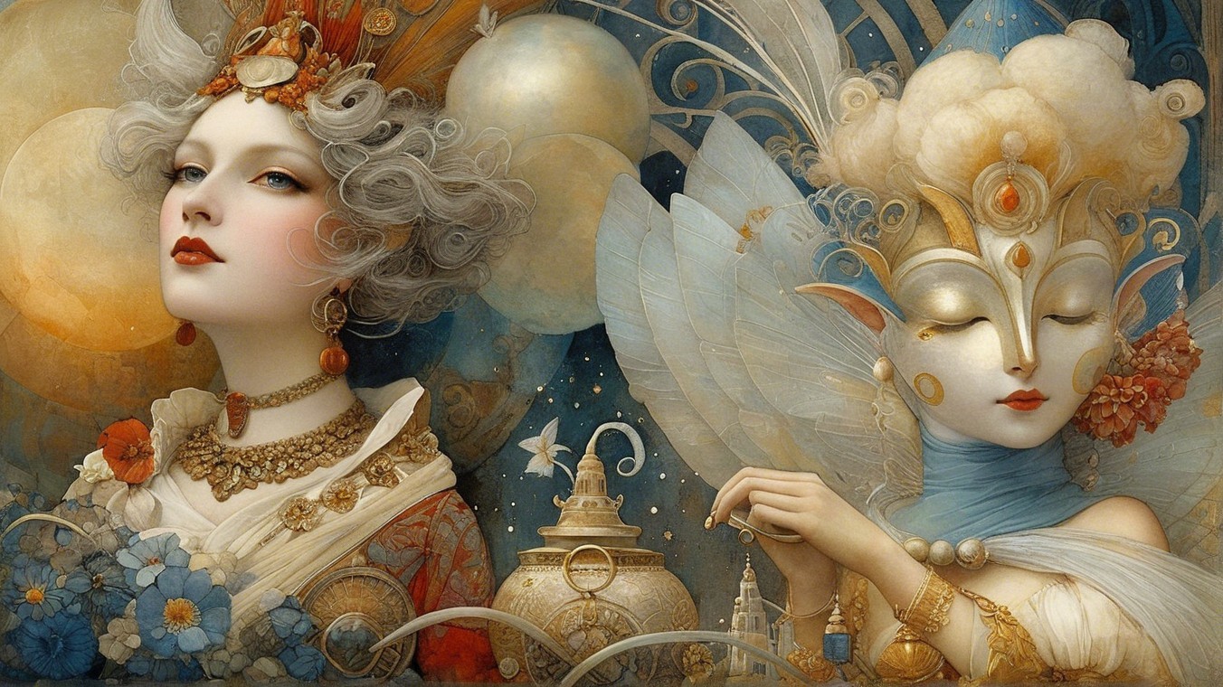 Two ethereal figures stand side by side, adorned in elaborate, regal attire with intricate headpieces. Their striking, porcelain-like features contrast against a dreamy, celestial backdrop.