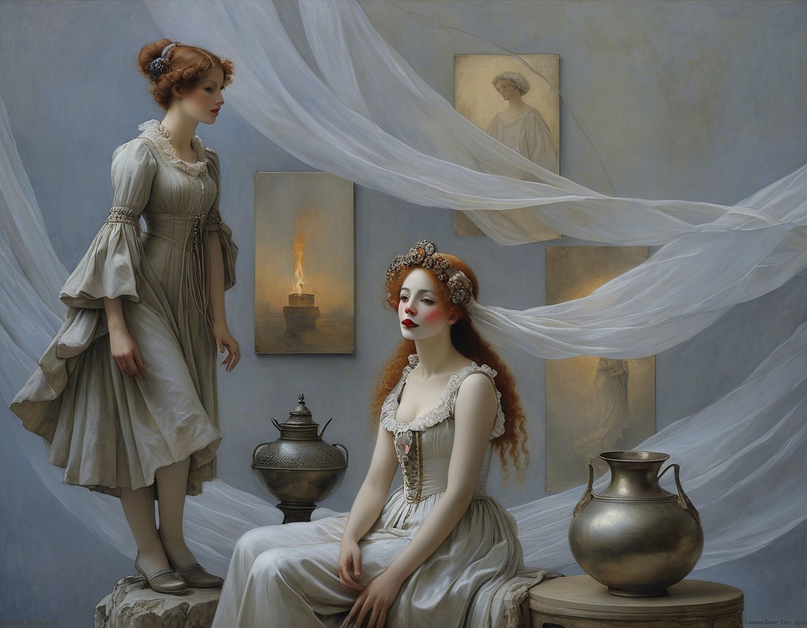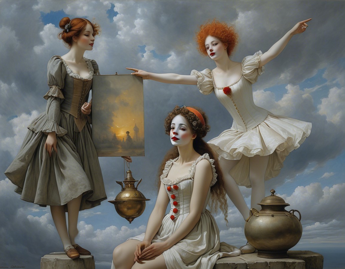 Three elegant figures dressed in vintage-inspired costumes pose against a dreamy sky. Their expressions and attire blend whimsy with artistry, creating a captivating, theatrical scene.