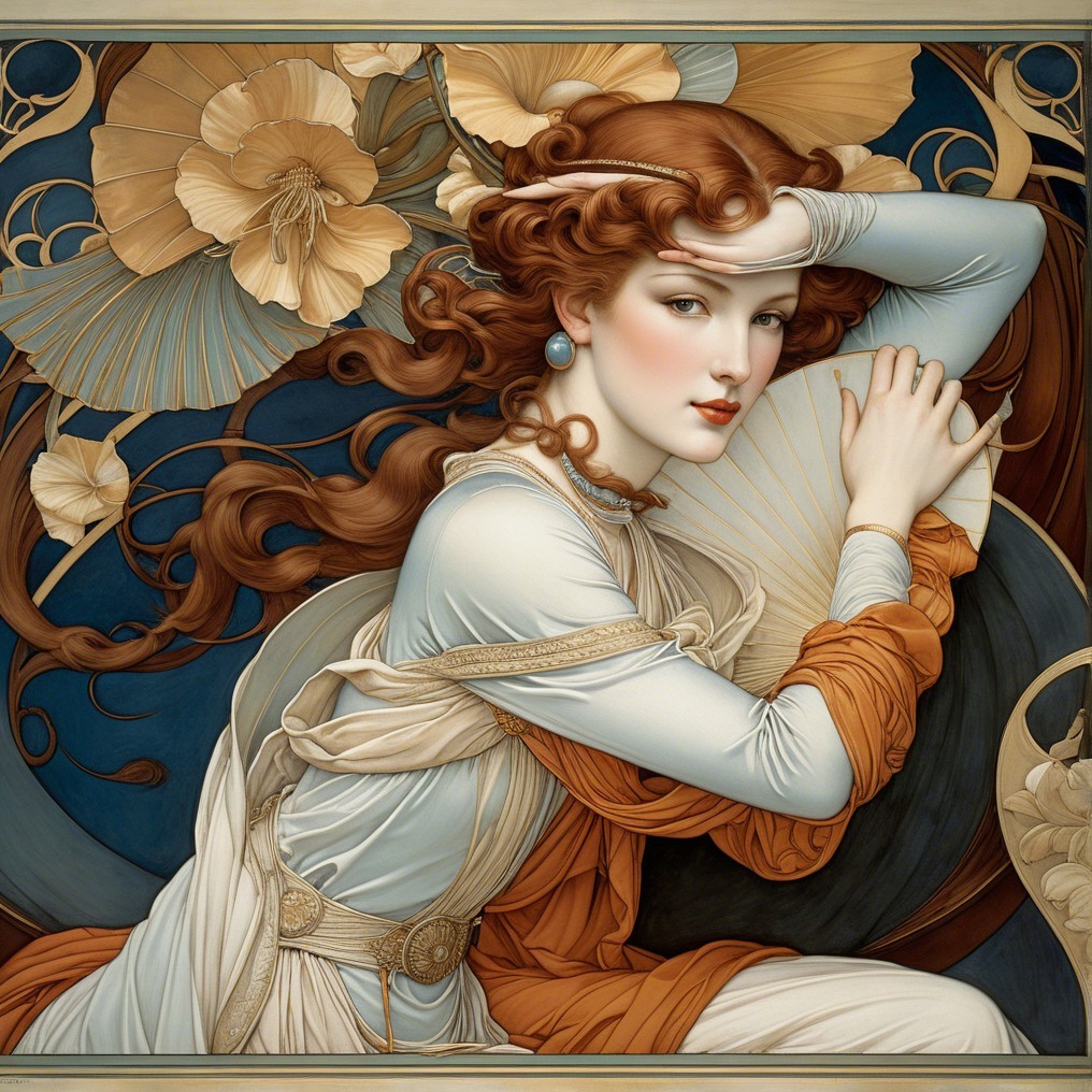 The image features a beautifully styled woman with flowing hair, elegantly draped in a white and orange garment. The backdrop includes intricate, art nouveau-inspired designs in soft colors.