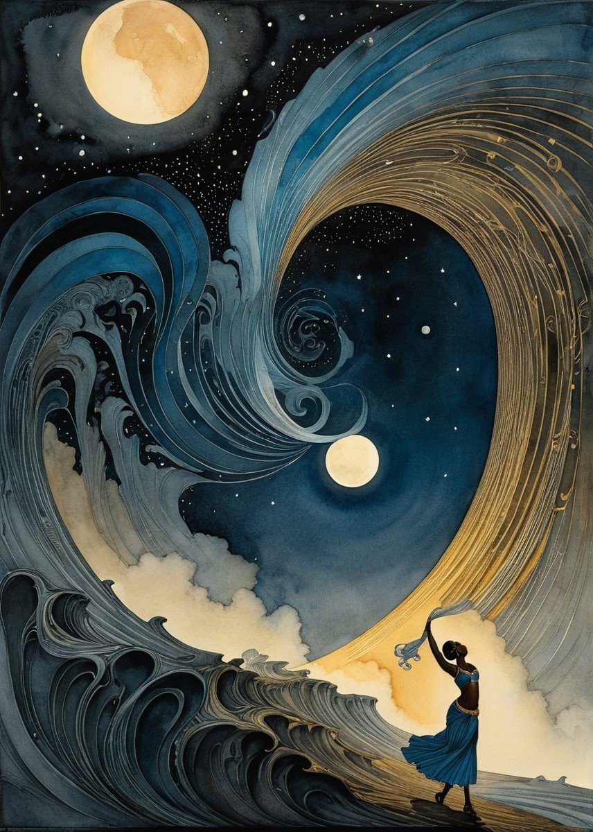 A graceful, dark-skinned figure dances on a crescent moon, adorned with intricate jewelry and flowing hair. The scene features a starry night sky and gentle waves, evoking a sense of harmony and beauty.