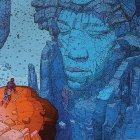 A lone figure stands atop a vibrant mountain landscape, gazing at a colossal, stone face looming in the background, surrounded by towering pillars and surreal celestial skies.