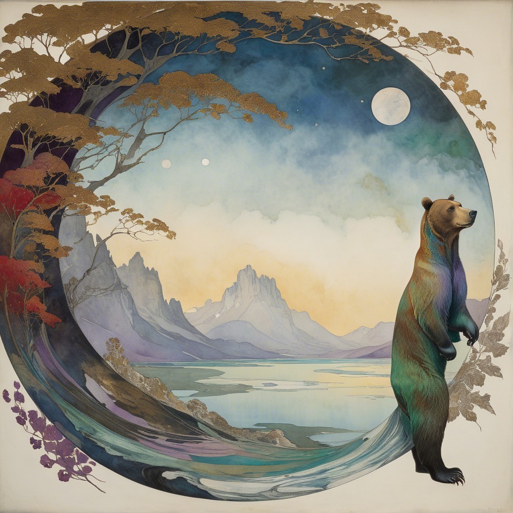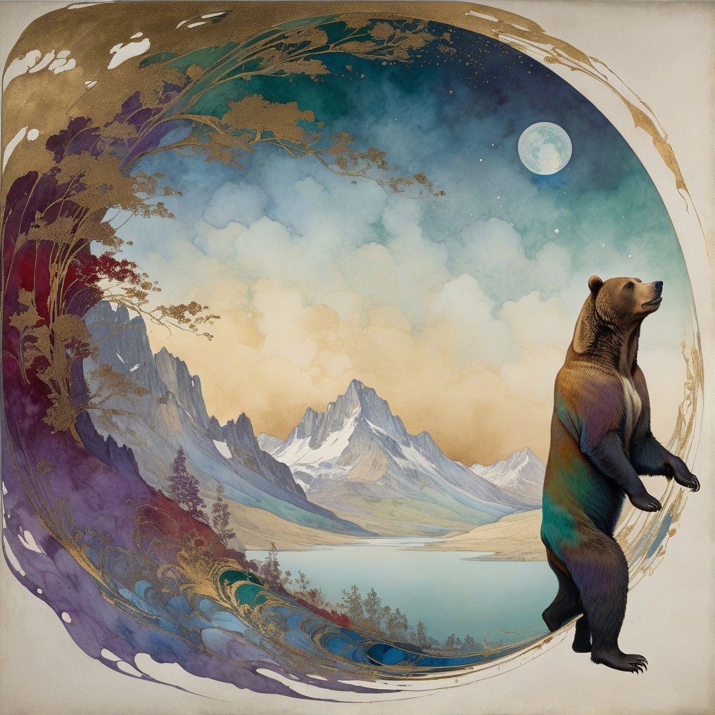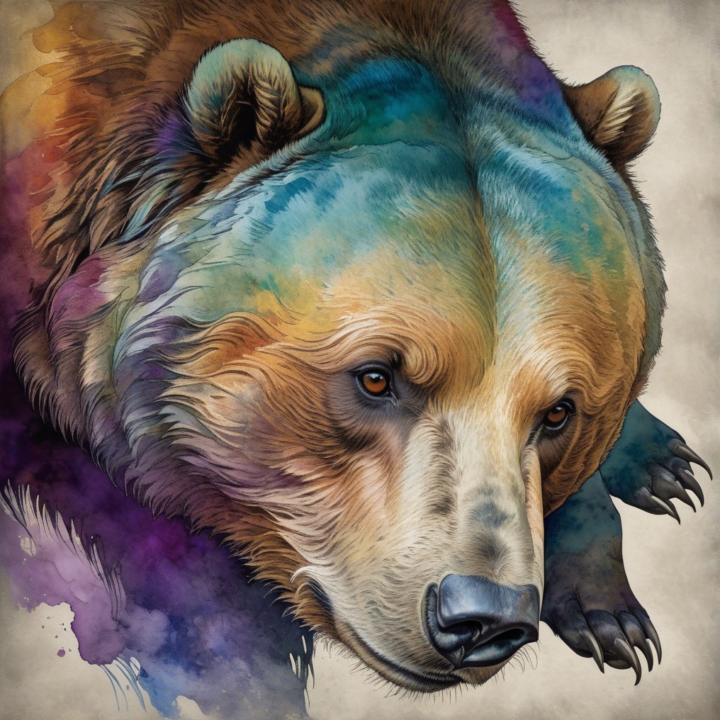 A vibrant, artistic portrayal of a bear's head, featuring a blend of rich colors and textures, set against a soft, muted background. The bear's expression is vivid and engaging.