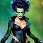 Prompt: the bride of Frankenstein, green & blue skin, curvaceous female standing and facing foreword, messy hair, woman full body, athletic build, large breasts, seductive, shapely, black tattered lace clothes