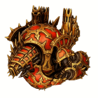 The image features a striking mechanical skull design, embellished with intricate red and gold armor, spikes, and gothic elements, showcasing a blend of fantasy and steampunk aesthetics.