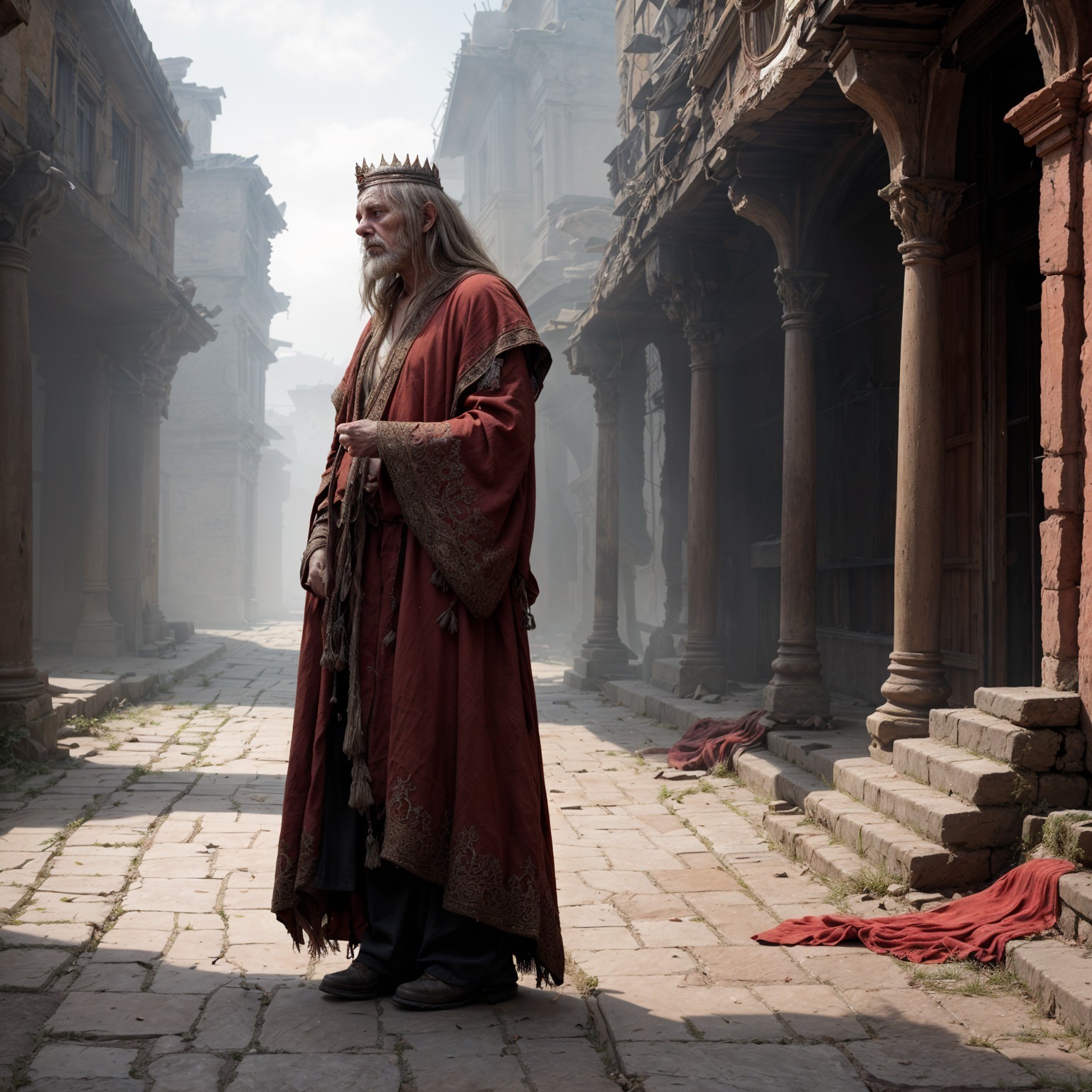 A regal figure in a flowing red robe and crown stands in a misty cobblestone street, surrounded by ancient buildings. A burlap sack leans against a nearby wall, adding a sense of intrigue.