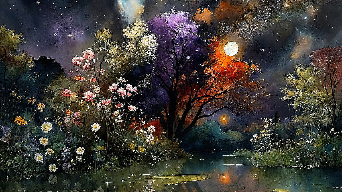A serene night scene with vibrant flowers in bloom, under a starry sky. Two glowing moons illuminate the landscape, reflecting on a calm river framed by lush trees and colorful foliage.