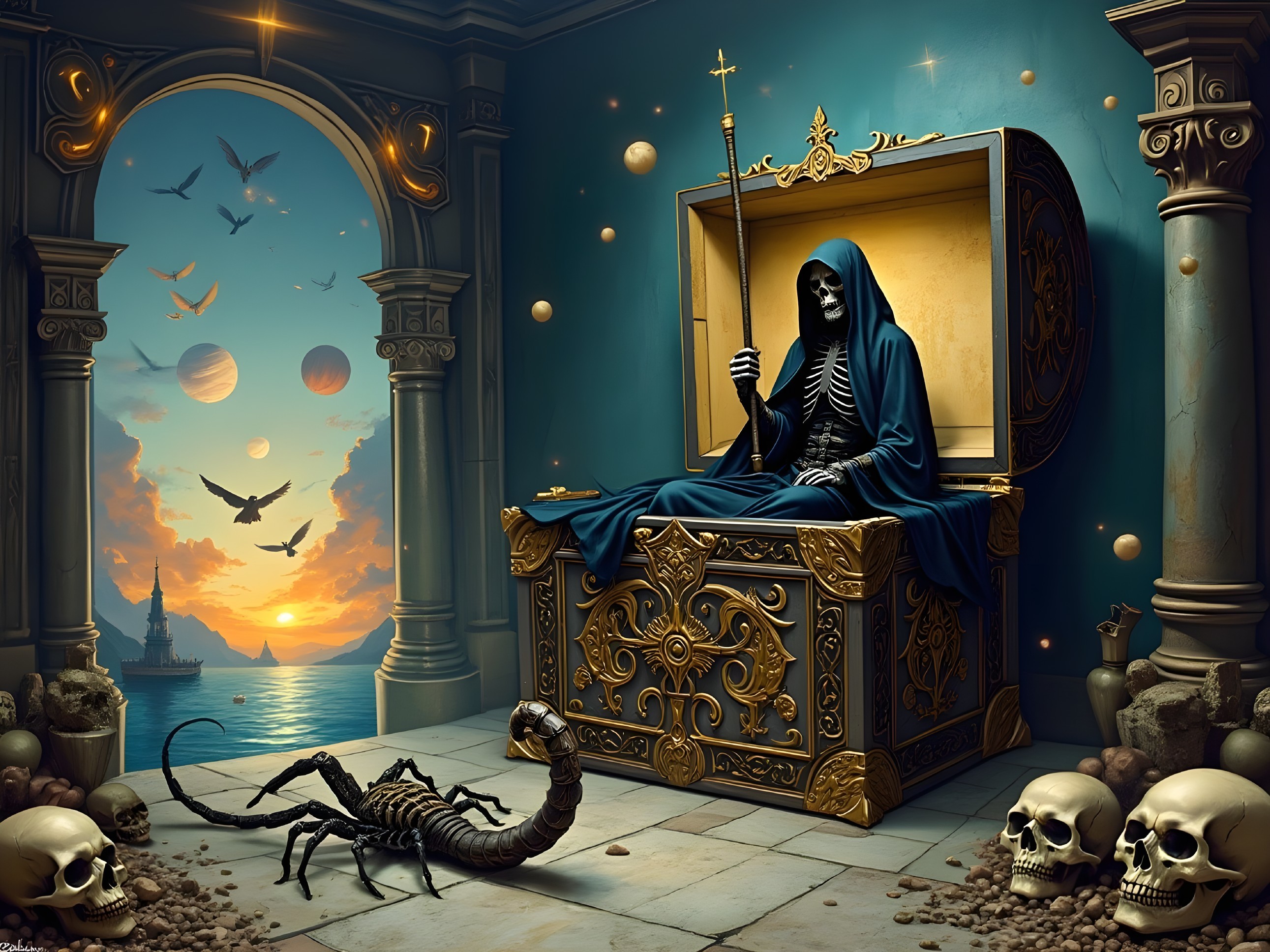 A cloaked skeleton sits majestically in a golden chest, surrounded by skulls and a scorpion, with a breathtaking sky and planets visible through an archway in the background.