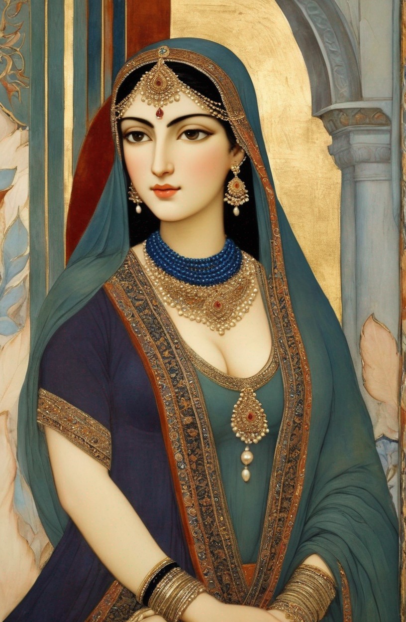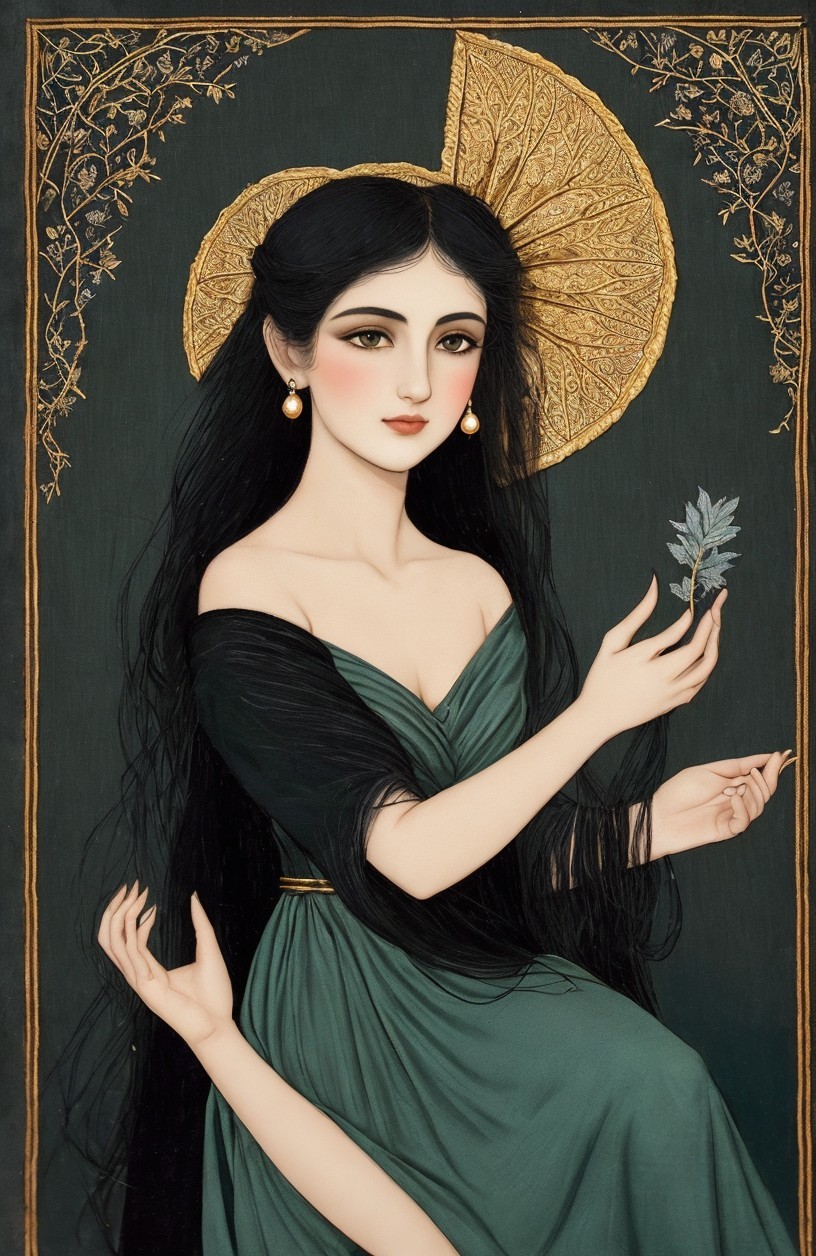 Her presence whispers of ancient tales, Like a breeze that through time sails. Elegant, poised, a gentle might, In her shadow, day turns to night". 3rd century Persian miniature art, golden ochre, sage green, pearl grey, paprika, blue-grey, Velvet Black, Shabby, Dull Gold, Amber Gray, Golden Ratio, Surreal Fantasy, Elegant, High Definition Ultra Fine 3D Line, Zenangle Style, Watercolor Patchwork , Arthur Rackham Style, Paul Kidby, , Jacek yerka, Extremely Detailed, Intricate, Thoughtful, HDR, Fractal, Beautiful, Award Winning, Fantasy Look, Fantasy, Crisp Quality