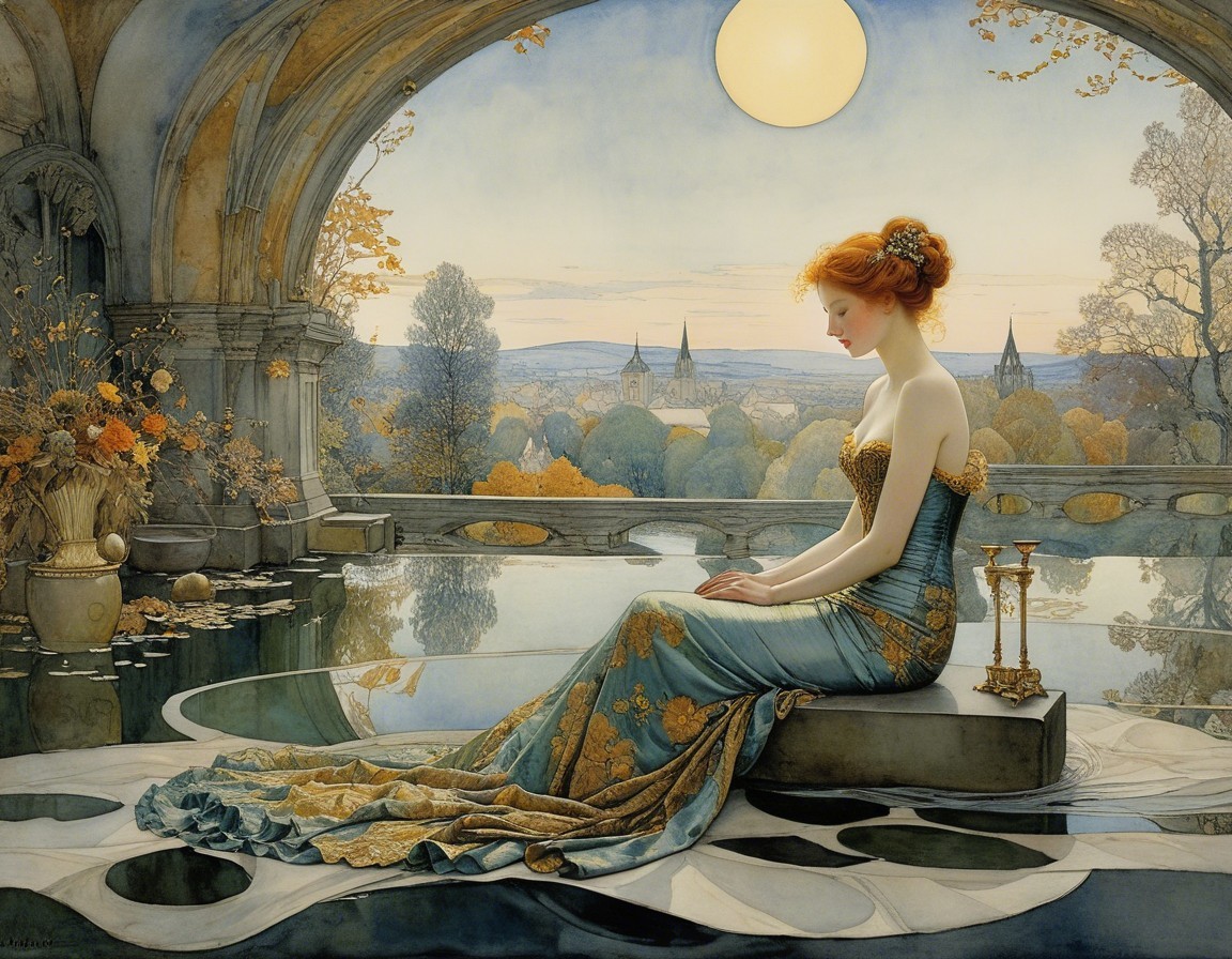 A serene woman in a flowing blue gown sits gracefully by an ornate window, gazing at a picturesque landscape bathed in golden autumn hues, with a tranquil river and distant towers in view.