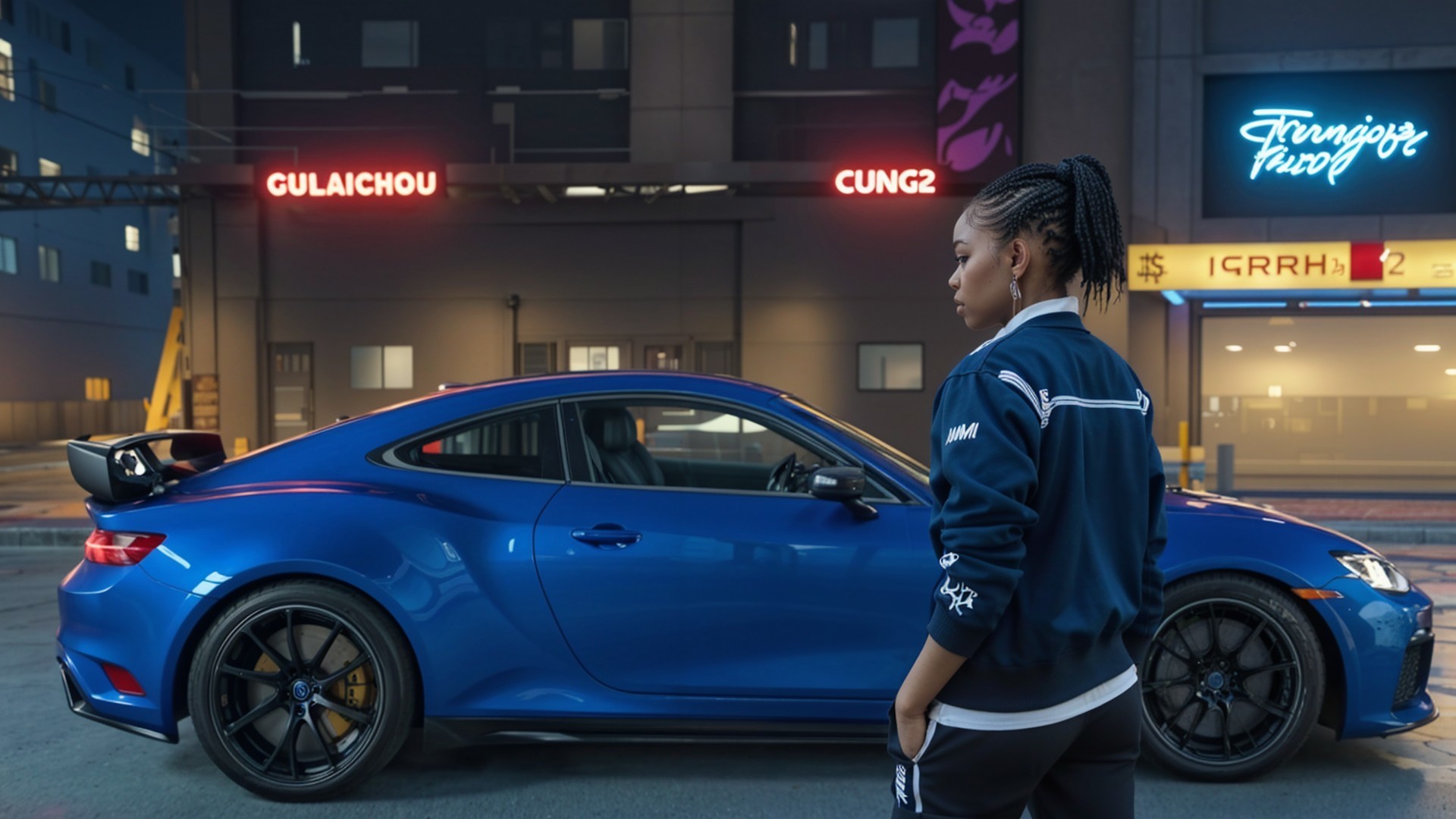 A sleek blue sports car is parked in an urban setting. A confident person stands beside it, wearing a stylish outfit. Neon signs glow brightly in the background, adding to the vibrant atmosphere.